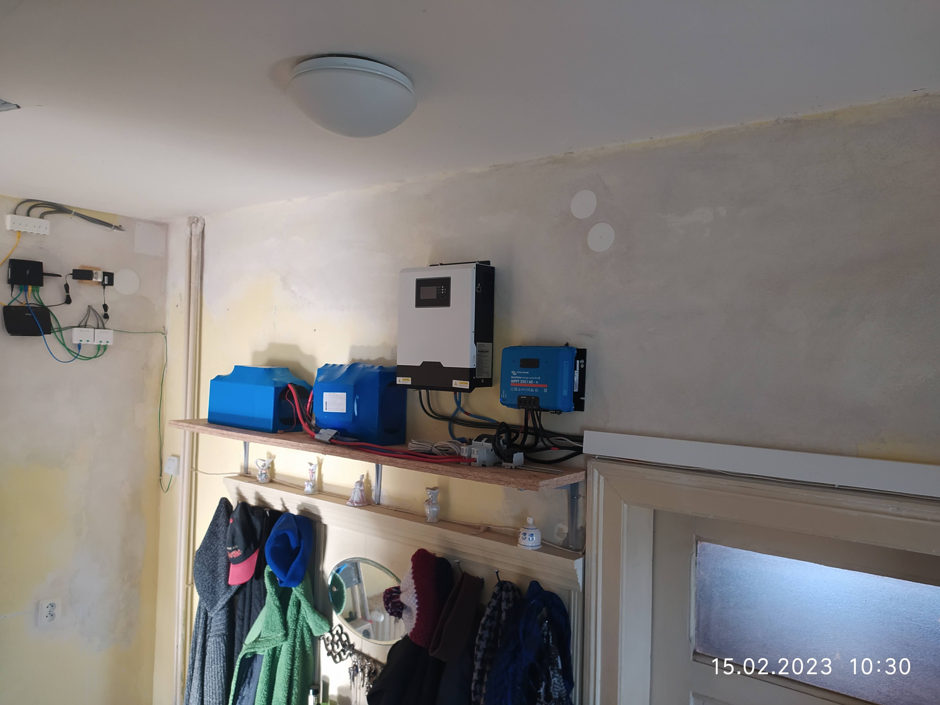 Byl zprovozněn ten starý měnič REVO který bude používán jak svítí tak bude napájet bojler a zásuvky v koupelně a ven na zahradu.