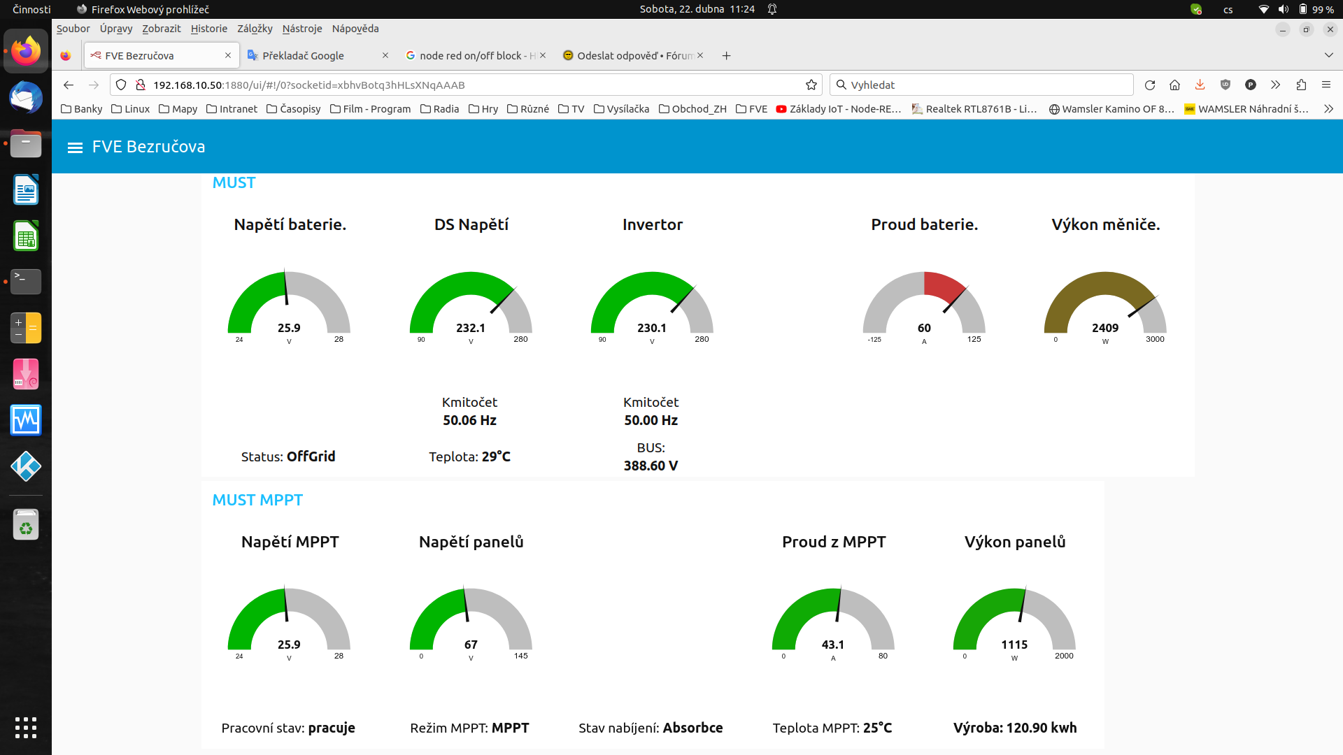 MUST 3KW 80A MPPT 24V/ 3,75kWp stringy 5s3P 200wp + 5s1P 150wp. 2 měnič MUST 3KW 80A MPPT 24V 6370Wp stringy 2S4P 400wp bifacial + 2S1P 410wp + 2S3P 395wp Baterie 28KWh lifepo4 (4X 8S 280Ah EVE), Celek tedy 10120Wp