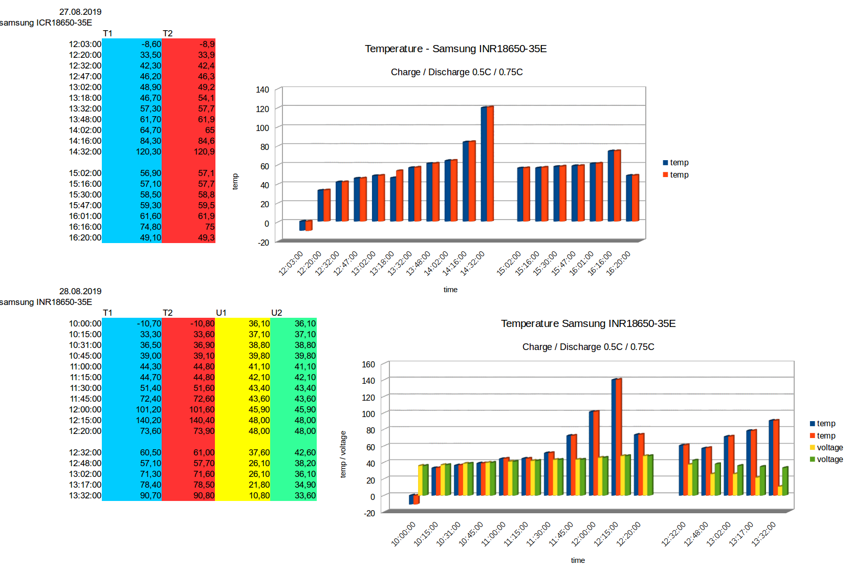 Charge: do 4.6 V 0.5C Charge: do 4.8 V 0.5C Grafy a tabuľky: Takže jeden z článkov vydržal 140 *C bez známok úniku plynu.