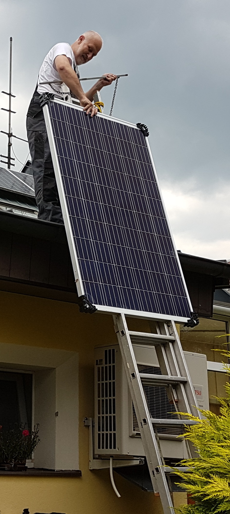 Vytahoval jsem panely také sám po žebříku. Jen jsem si jej otočil tak, aby mi na něm vznikly stupínky na bezpečné odložení panelu. Na fotografii stojí panel na posledním stupínku. V ruce držím závěs na kterém jsem panely vytahoval. Je zakleslý za vnitřní hrany rámu a lze jej velmi snadno vyháčit i v poměrně nepohodlné pozici (lépe než karabiny navlečené v díře v rámu panelu). Na tomto závěsu jsem zvedal panely i na střechu se sklonem 60°. Tam jsem si ale pomáhal kladkou zakotvenou nad hřebenem střechy.youda píše:Jak dostat panely na střechu