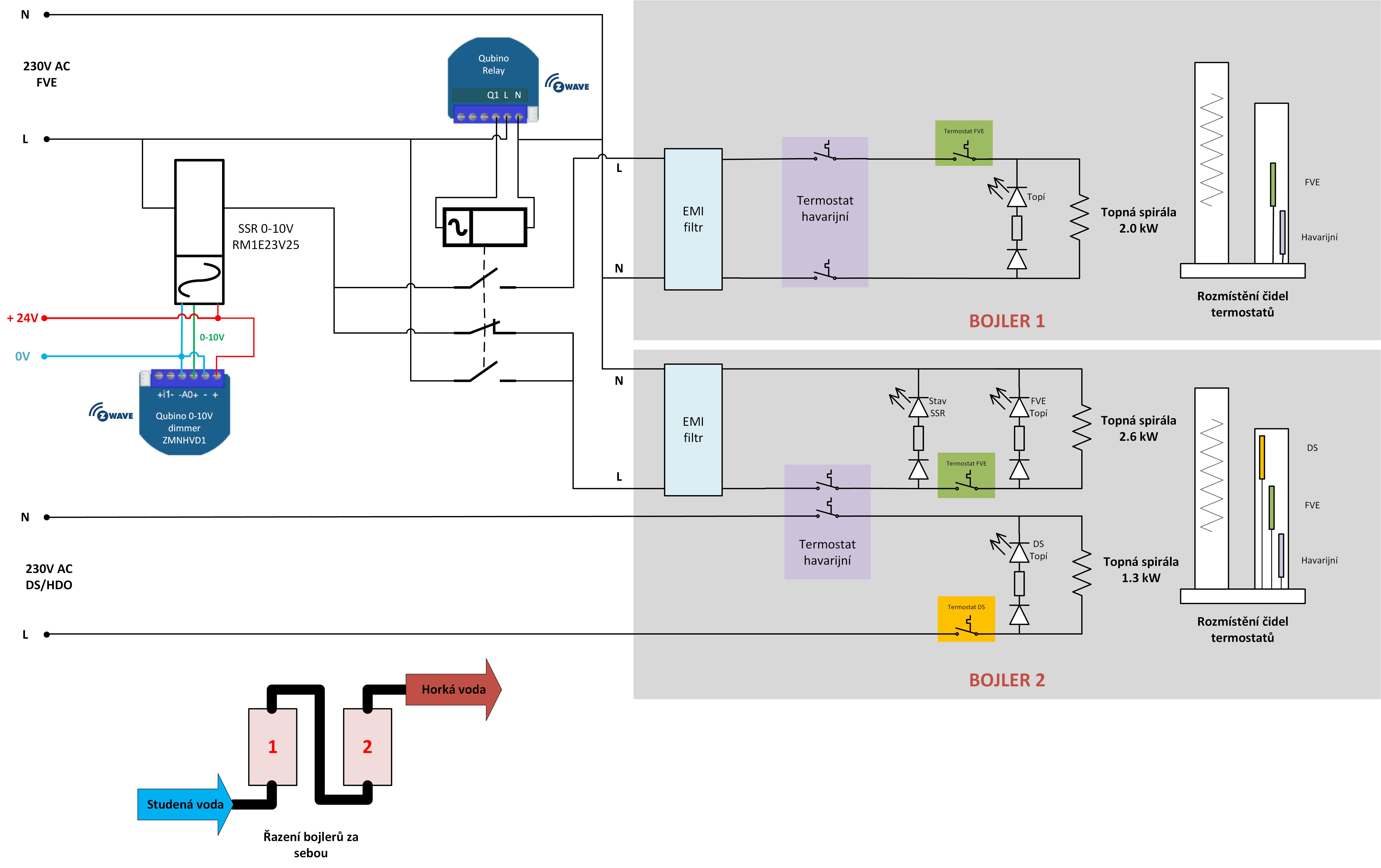 Asi jediný přečin proti bezpečnosti je, že u Bojleru 2 jsem tovární bezpečnostní termostat použil pro odpojení obou samostatných napájecích okruhů (FVE i DS), viz schéma. Správně by měly být bezpečnostní termostaty dva a každý z nich by měl odpojovat oba pracovní vodiče svého okruhu. Možná to někdy dodělám.