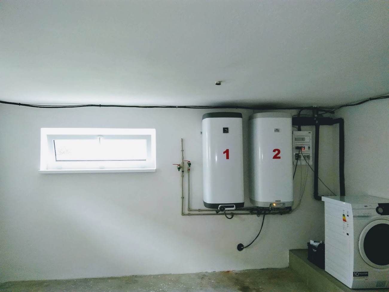 - Dva 160L bojlery v sérii. Studená voda půjde do B1, tam se předehřeje a pak proleze do B2, kde se ohřeje hodně.
