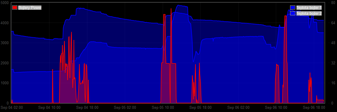 Bude-li alespoň jeden den slunečno, nahřeje se neprve Bojler 2 a poté se nahřeje i Bojler 1. Bude-li přebytků opravdu hodně, pak se dokonce mohou nahřívat oba bojlery zároveň. Přitom samotné fázové řízení zbytečně necvičí celou zátěží (4600W), ale buď řídí jen prvních 2600W, nebo je oněch 2600W napevno a SSR již řídí pouze zbylých 2000W. Díky tomu vzniká méně VF rušení a také to dává menší záhul měničům.