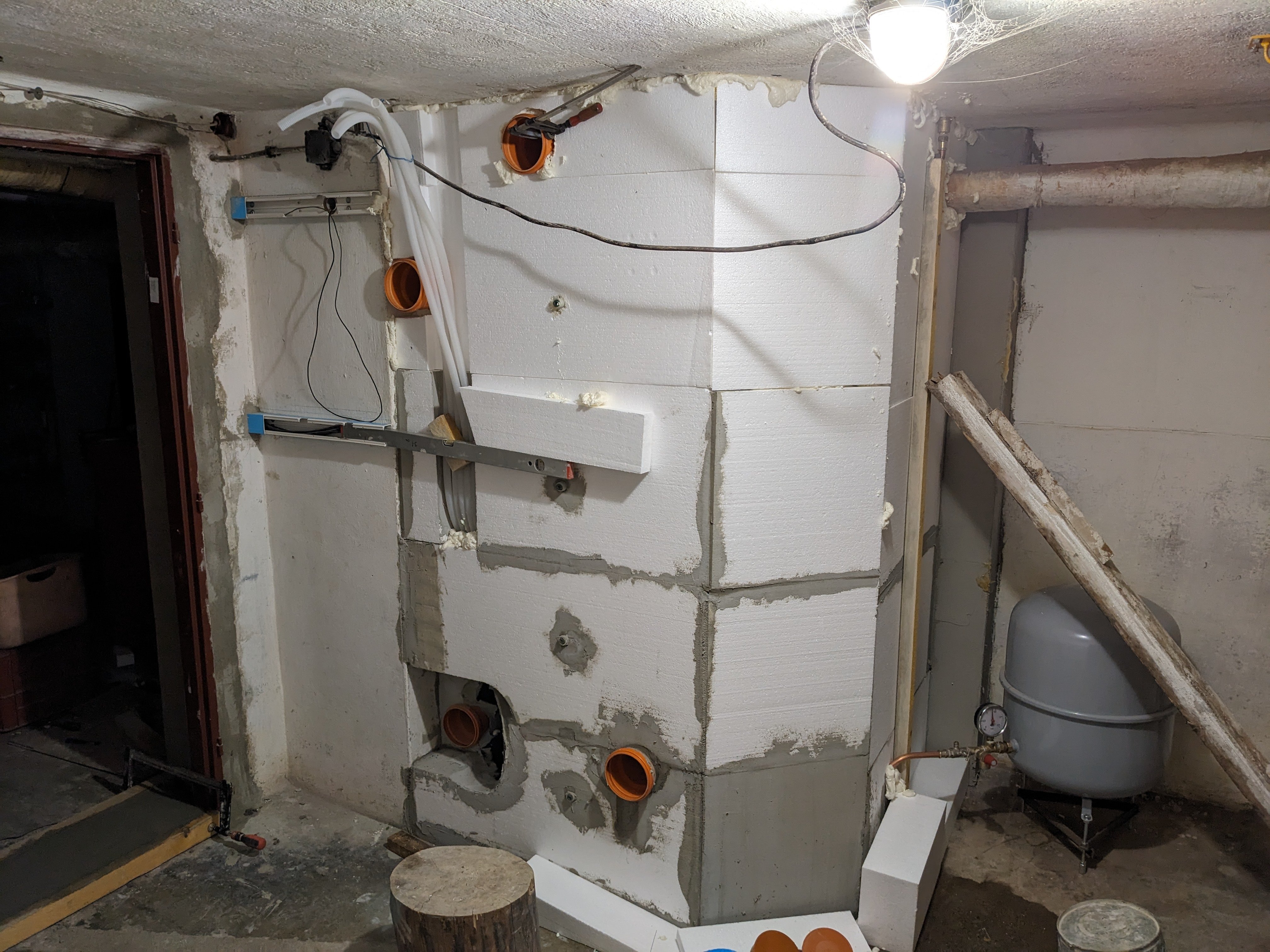 Dokončena izolace akunádrže polystyrenem, slepeným nízkoexpanzní pěnou, lepidlo na polystyren měli v našich stavebninách jen v kartuších pro pistole a na ten kousek se mi nechtělo kupovat pistoli + čistič. Příští týdem dopěním svislé spáry, dnes jsem to raději nedělal, aby mi to pěna neroztlačila. Pak perlinka + lepidlo.