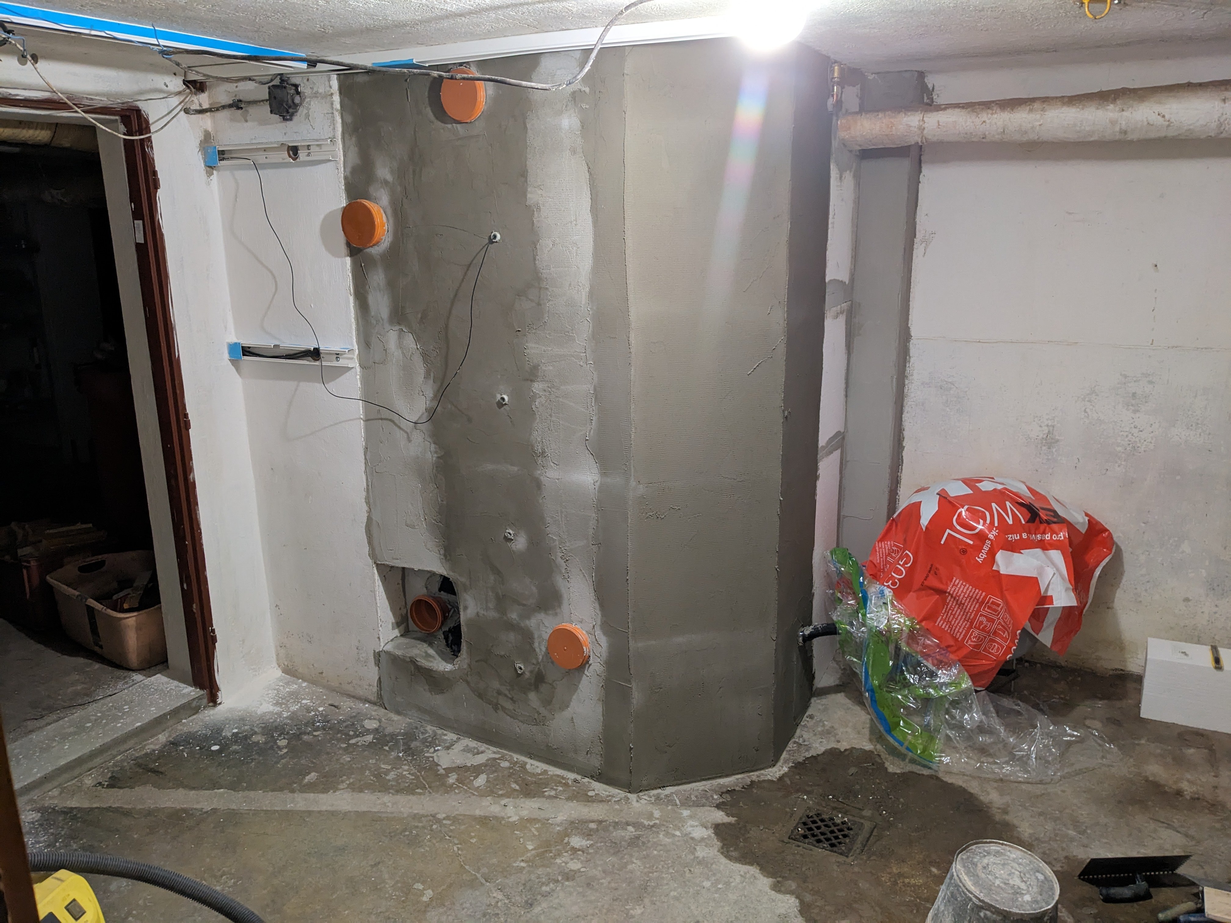 Vystěrkováno, obloženo, vyspárováno, vyštukováno, namontovány rozvaděče pro ovládání čerpadel a ohřev.