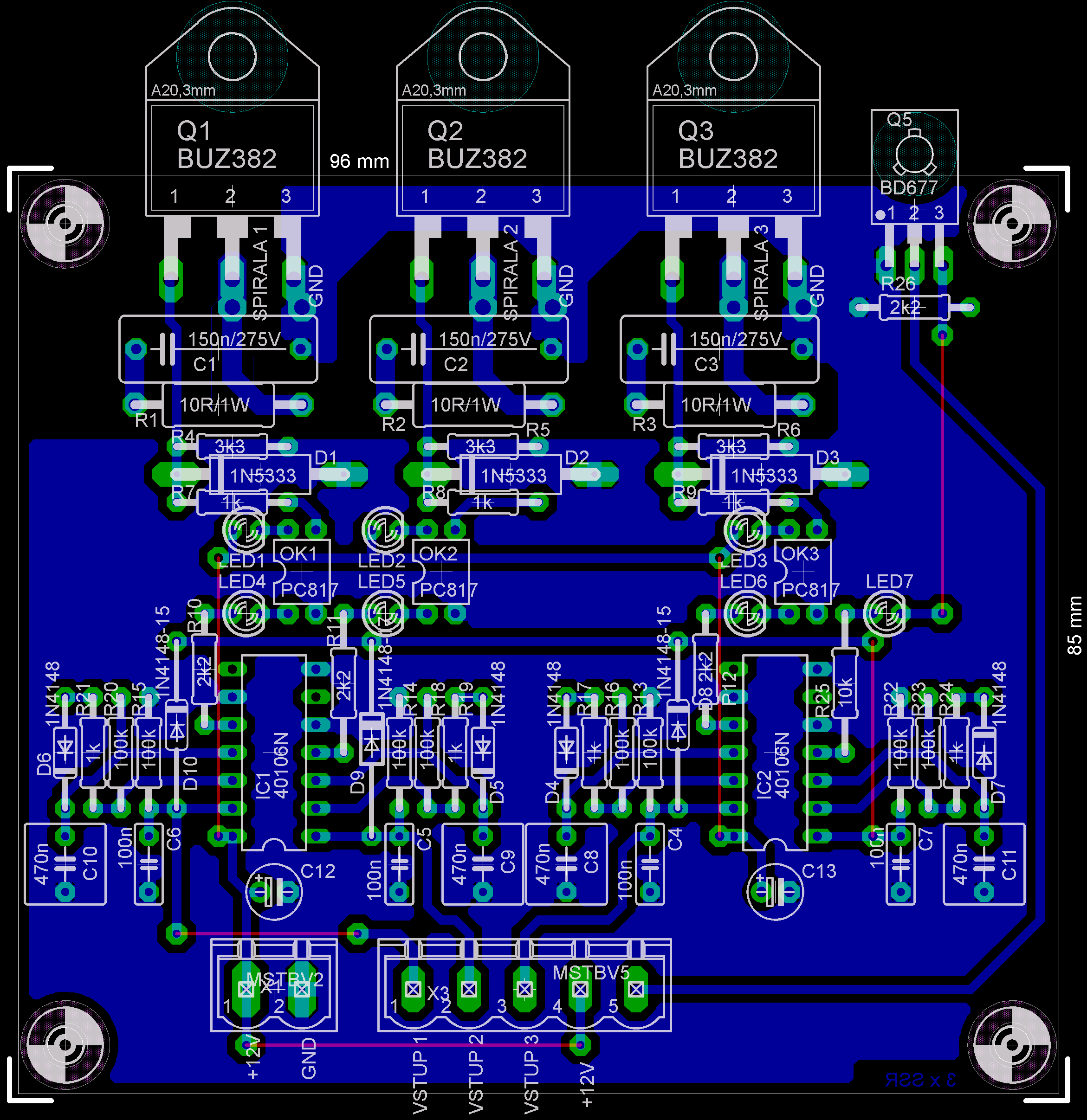 První nástřel DPS pro spínání 3 spirál na 48VDC. IO 1 a 2 by měly zajistit zapnutí stykače před zapnutím kterékoliv spirály a vypnutí stykače po vypnutí všech, zbytek jsem sprostě okopíroval z Kostějova vytěžovače. Stykač 3f ABB AF09ZB-30-10-21, jmenovitý DC proud pro 1pól 72V 25A. Pokud někdo vidí nějakou zjevnou chybu, prosím o upozornění.