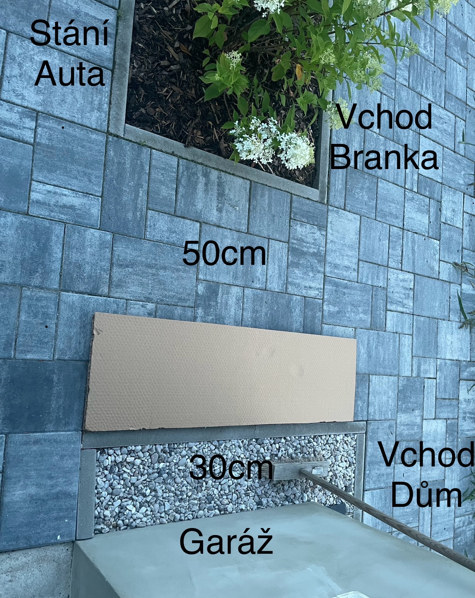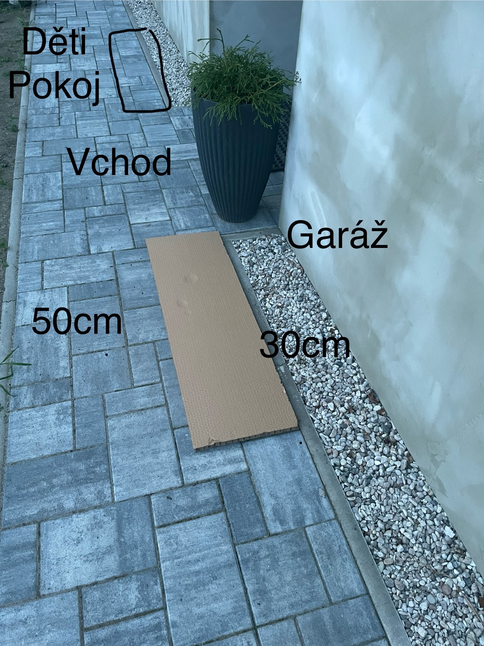 Nejlepsi varianta je ta u detskych pokoju protoze tam chodnik pokracuje uz jen ke drevniku takze by to nejmin prekazelo a trubky do 9m ale mam obavy z hluku. Jeste me napadlo u ty varianta kde stoji auta ten chodnik trosku rozsirit protoze se tam dost chodi.
