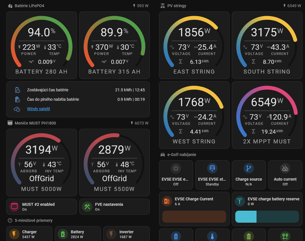 Polostrov 7,7kWp, 1f menič Daxtromn 10kW, LiFePo4 30kWh, tepelné čerpadlo LG Therma V Monobloc 9kW, ohrev vody z prebytkov, HomeAssistant