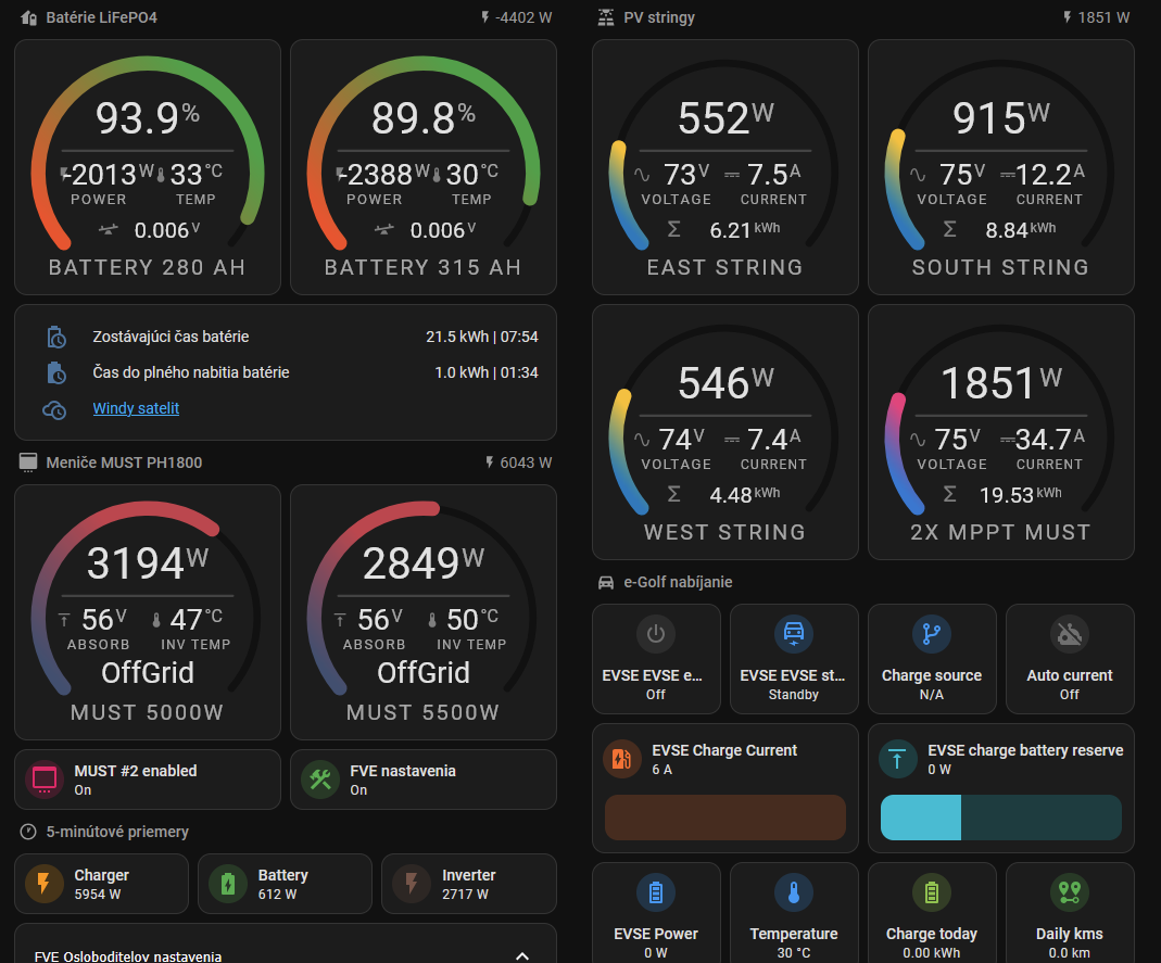 2x MUST PH1800 5.5kW, 9kWp V+J+Z, 600 Ah LiFePO4 s BMS JBD 200A, SW: Home Assistant na Synology DS923+ ku tomu ESPHome, Tasmota, MariaDB, InfluxDB, Telegraf, Grafana, Zigbee2MQTT..., HW: ESPlan (ESP32 + LAN 8720 + RS485). Nejaké moje projekty: MUST-ESPhome, ELTEK Flatpack2 ESPhome, ESP32-EMON, PZEM-017@WiFi, diyBMS-CurrentShunt-ESPhome , BMS UART-TS485 adaptér