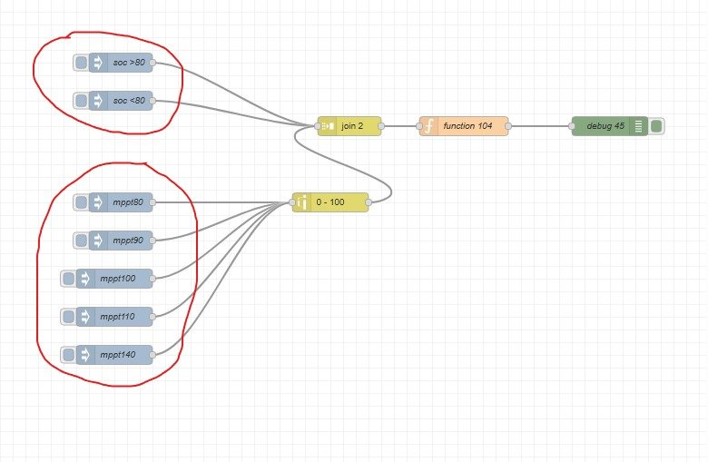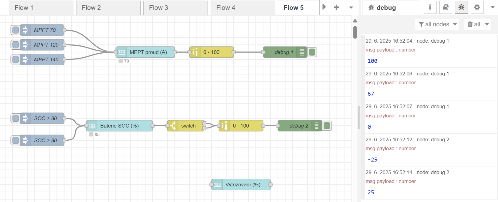 a funguje to tak ze ked posles hodnotu soc ze je viac ako 80% tak function uzol ti posle na vystup prave hodnoty z mppt(teda uz z v rozsahu 0-100),Uzol debug potom nahradza nejake to rele ale teda nerozumiem ktore rele sa ovlada 0-100.....