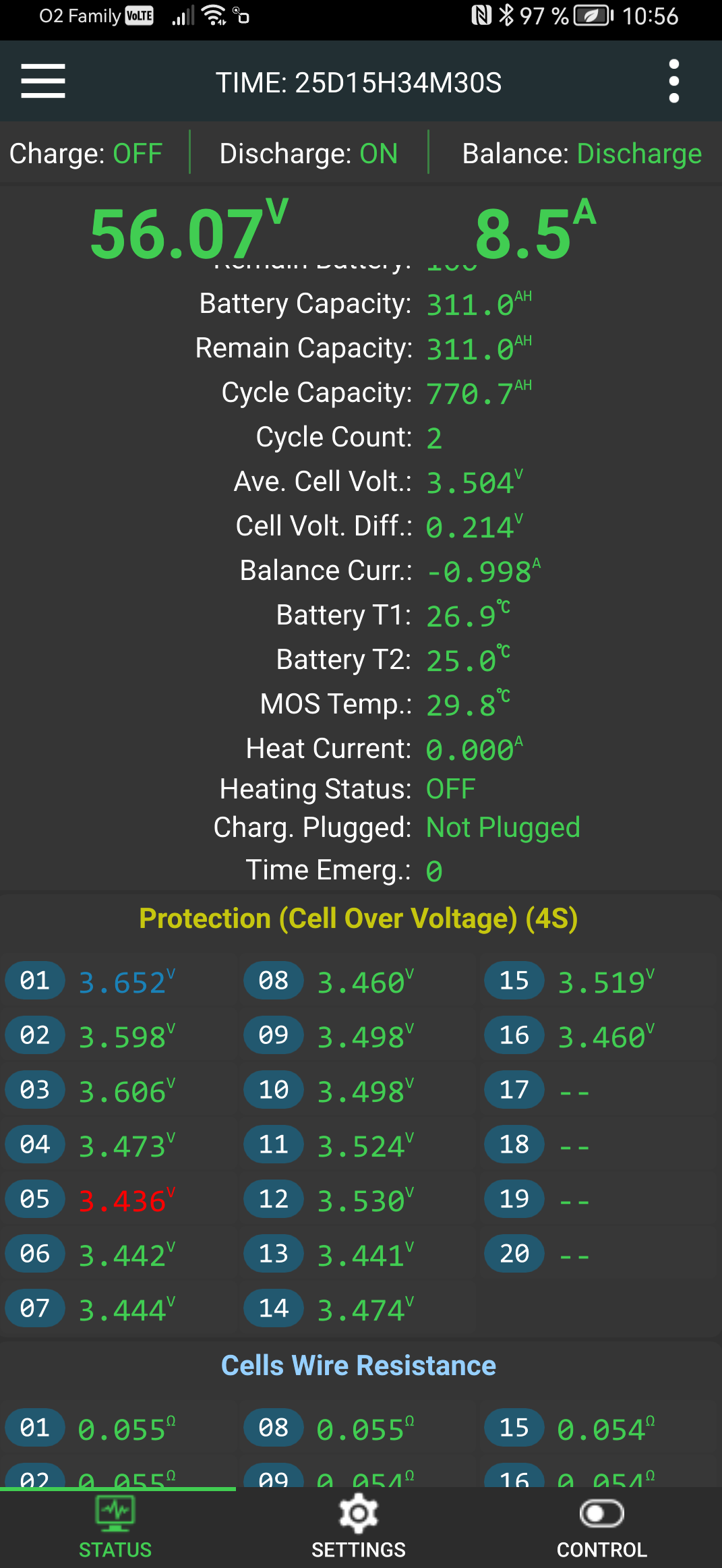Aktuálně mám na JK-BMS nastaveno vypnutí nabíjení při dosažení maximálního napětí na článku, tedy 3,65V a celý systém VICTRON na 56,8V, tedy teoreticky 3,55V na článek. Balancování napětí u mě probíhá proudem max. 1A. Proto mám balancování zapnuto už od 3V i když z hlediska interní spotřeby to asi není úplně ideální. Při nízké spotřebě se pod 3V vůbec nedostanu a to vlastně znamená, že JK-BMS balancuje 24/7. Každopádně mi to takhle přijde lepší, než když bych vyrovnával až v napěťové špičce a tedy v omezeném čase nejrychlejšího článku.