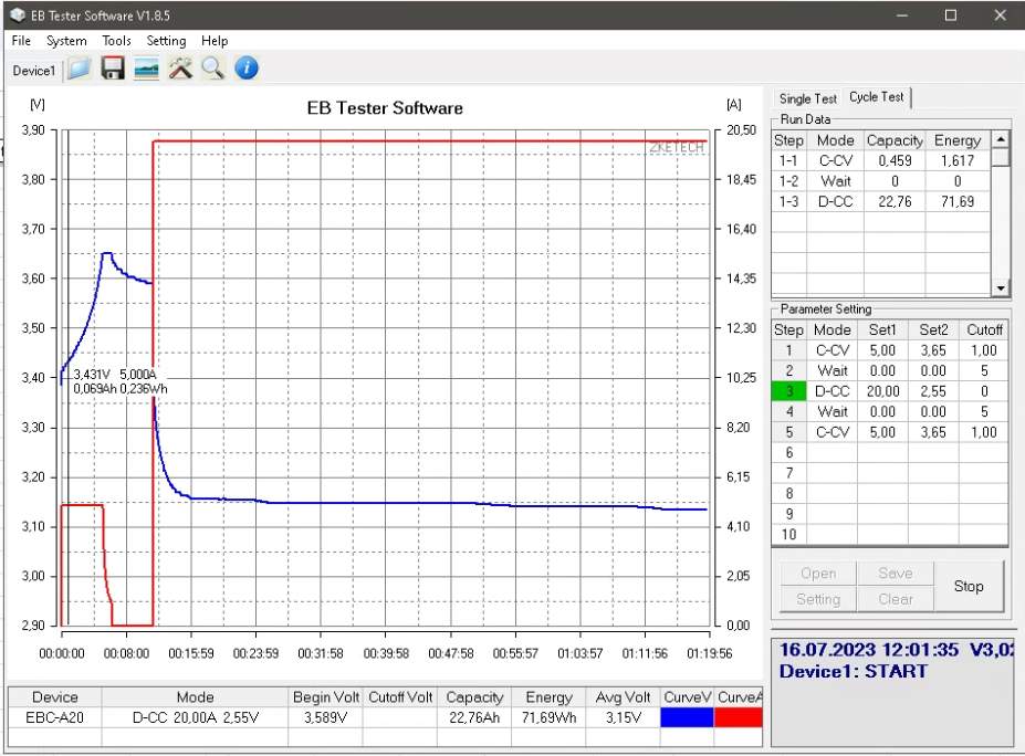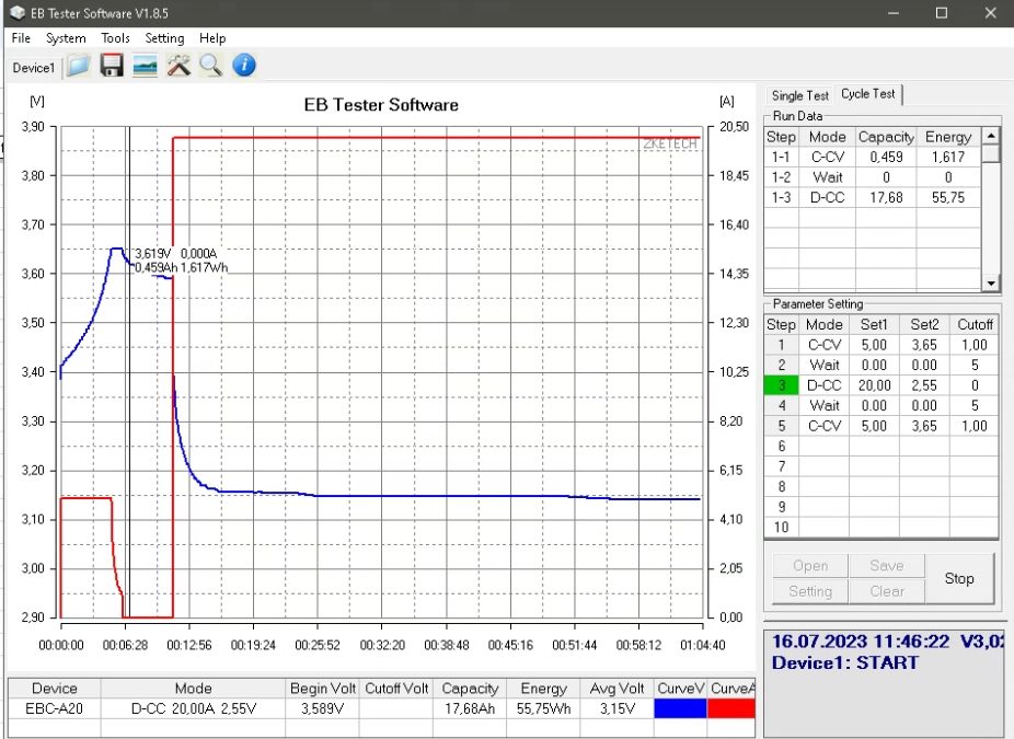 NO a teď tedy drobná aproximace. Při testu nabíjení starších WINSTON 60Ah jsem si změřil tyhle napěťové úrovně přibližně A) při napětí cca. 3,431V a B) při napětí za nabíjecí špičkou 3,619V. Rozdíl těchto dvou úrovní v přijaté kapacitě je 0,459Ah- 0,069Ah = 0,39Ah. Skutečnou kapacitu článku ještě měřím...ale těch 60Ah to bude. Tedy poměrově nějakých 0,65% z kapacity. Při reakci BMSky na OVP článku č.1 bude tedy chybějící nevyužitá kapacita na EVE 304Ah nějakých 1,97Ah. A tedy při balančním proudu 1A by se BMSka měla o podobný rozdíl "kapacity k balancování" schopna postarat za 2 hodiny balancování. Ano, musí se postarat o větší počet článků než jeden, ale více než polovina článků má v tento okamžik napětí kolem 3,50V, takže mi to přijde docela OK nastavení které má potenciál udržet dlouhodobě stav balancovaných článků.