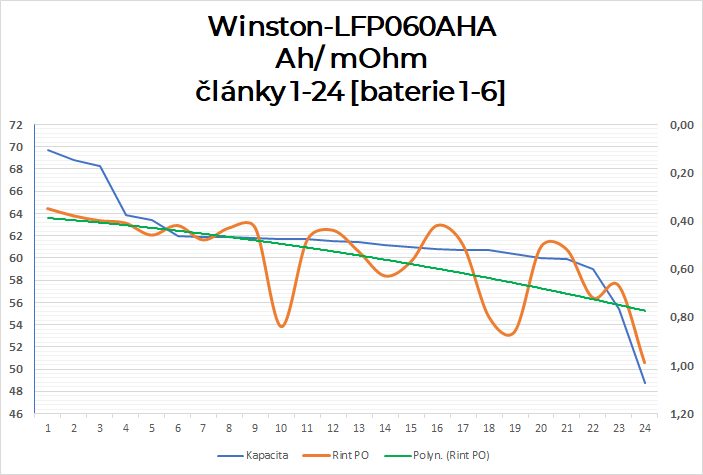 C. Z grafu je naprosto zřejmá závislost vnitřního odporu a kapacity. Akorát ta volatilita hodnot je tak velká, že měření vnitřního odporu jako vyhodnocení předpokládané kapacity článku asi moc použít nejde. Pro vyhodnocení extrémních stavů článku, tak to už použít jde. Pokud tedy uvažuji o nákupu použitého WINSTON článku nebo baterie, pak vnitřní odpor kolem 0,8 mOhm a více je jasná indikace faktu, že s článkem není už něco v pořádku a je třeba být opatrný.