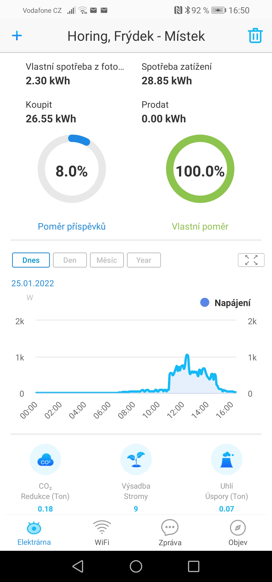 Tak u nás počasí stejné vyrobilo to za celý den 2,3kWh. Výkon mám 8,2kWp a do restartu v 10:55 to mělo výkon 40-80W po restartu 500-600W. Na grafu je ten zlom (restart) pěkně vidět i když ke změně světla vůbec nedošlo. Tak to asi pak nebude chyba jen mne. Možná má nějaký soft jen problém s tímto mlhavým počasím. Zkuste to přes den taky natvrdo vypnout a zapnout jestli se to chová stejně jako u mne.danidani píše:Dnes, Cerhovice (střední Čechy), celý den pod mrakem, průměr 120 W z 5,4 kWp. Za celý den 0,7 kWh. FW 060616.