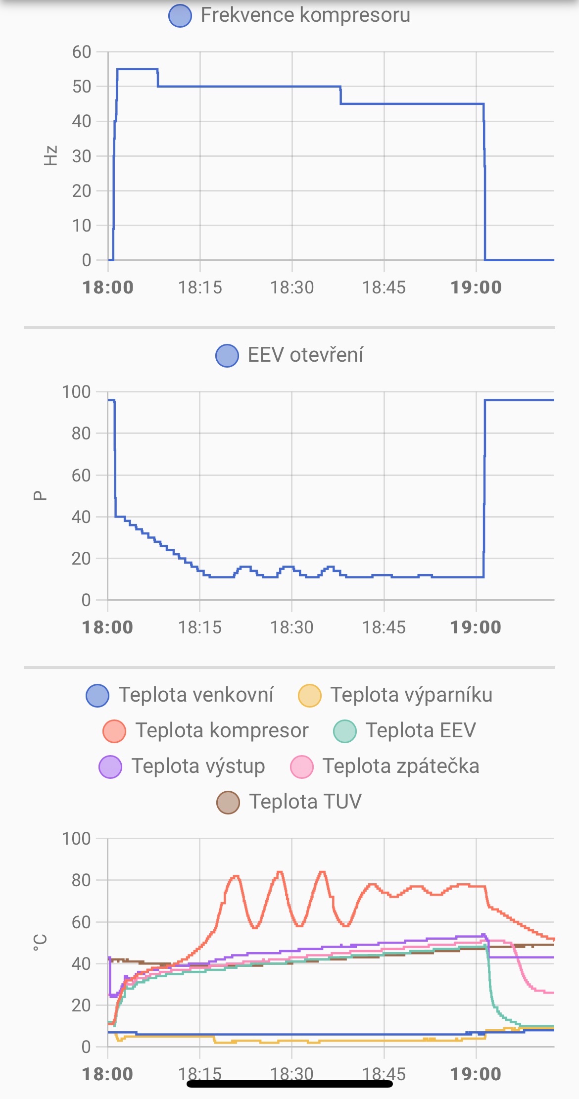 Frekvence 55Hz, EEV 11, ohrev TUV 48C , EEV reguloval 11-16, COP kolem 2,2. Prijde mi ze to lepe jede na tovarni nastaveni je tam lepsi COP.