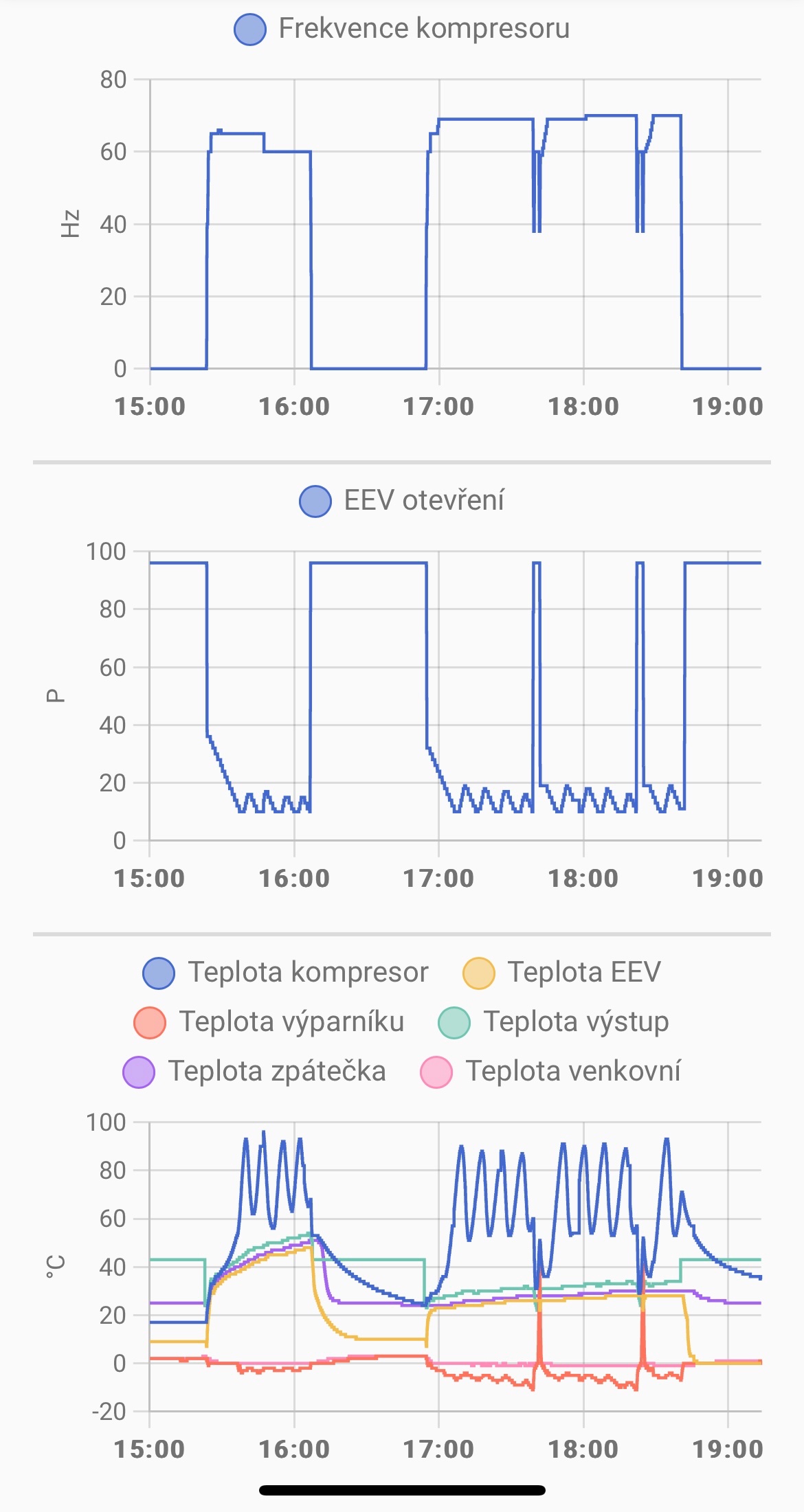 Nastaveno 70Hz a EEV 10. Regulace EEV 10-19 spodni hranice ale teplota kompresoru pri ohrevu TUV vylezla na 96C a pri topeni 35C na 90C. Budu muset zkusit zvednout EEV na 12 protoze frekvenci stahovat nechci pak je problem s ohrevem TUV.