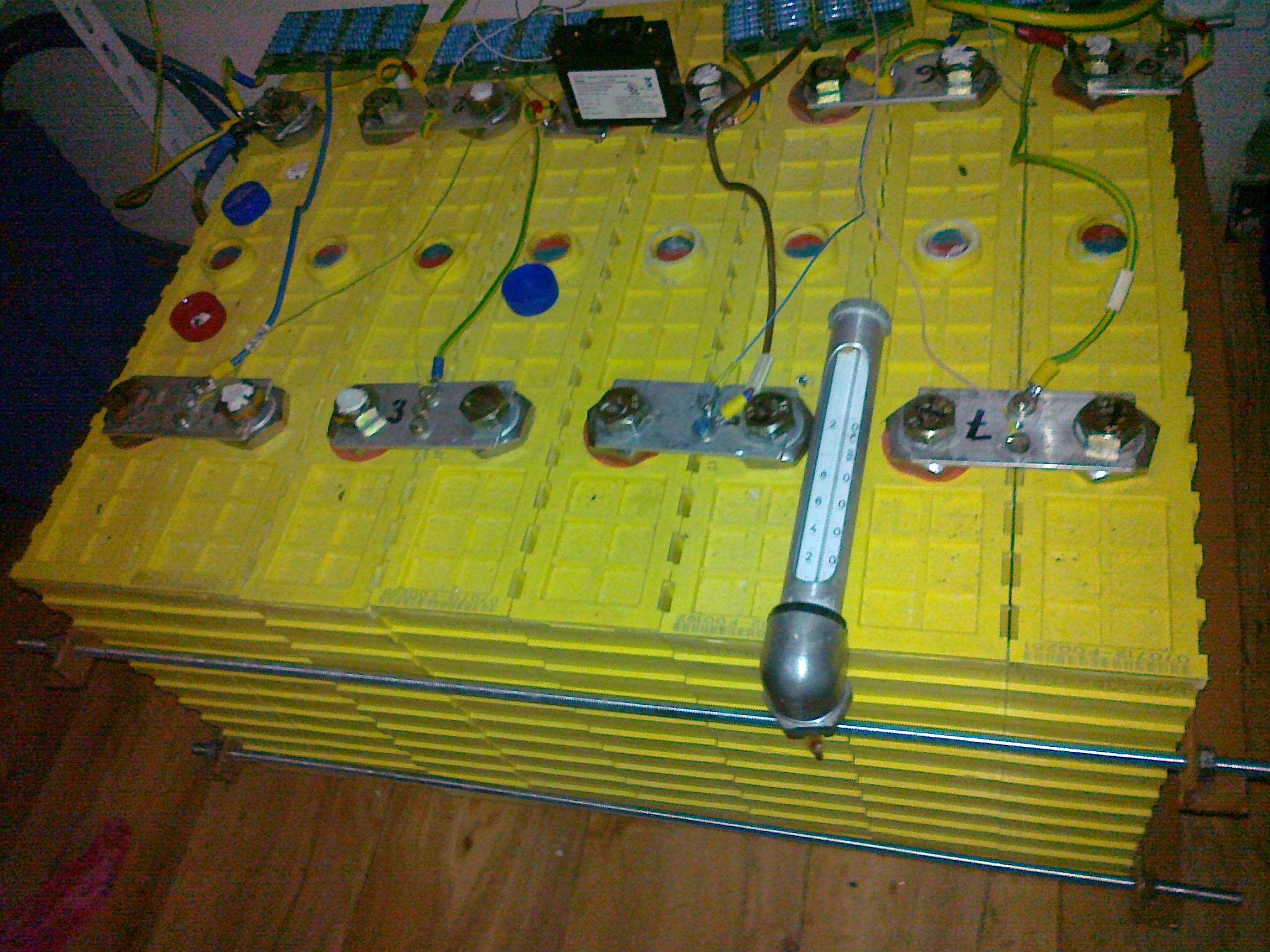 . 5 článků mělo při loňském testu nad 200Ah , jeden těsně pod 200Ah a dva kolrm 170Ah (shodou okolností nej-nafouklejší) . K docílení jednotné kapacity 240Ah+ u všech 16-ti článků jsem ke všem "200Ah" Winstonům paralerně přidal chibějící kapacitu menšími články . No , donedávna sem si myslel že je stav stabilní ... jenže není