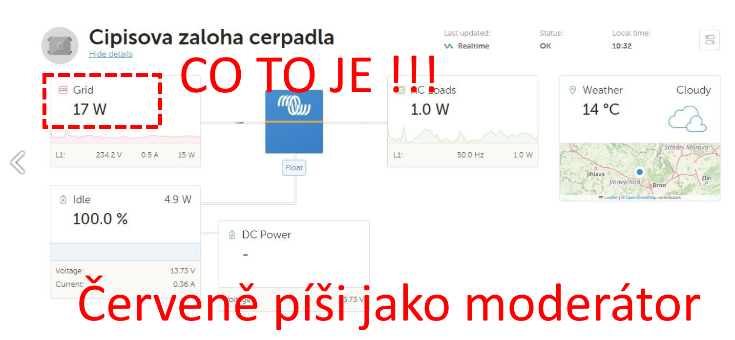 Vidíš v tom nějaký problém? Chtěl jsem to řešit i s přepínačem, že by si to bralo elektřinu z mojí FVE, ale zatím veškeré automatické přepínače (a to nemyslím ty čínské sračky) neměly takovou spolehlivost, abych klidně spal. Takže jsem to nakonec pořešil tak, že si to bere z 3f elektřiny společných prostor automaticky funkční fázi, a MultiPlus je nastavený jako čistá UPSka. Testy nějaké proběhly, nicméně stejně přidám další hladinový alarm, a manuální přepínání na jakýkoliv zdroj elektřiny. Vzhledem ke dvěma přípojkám na baráku a mojí FVE by snad mohlo něco být k dispozici, když by došlo k maléru. To mi připomíná, že bych mohl také vyzkoušet po roce centrálu. A natankovat nějaký kvalitní benzín, co vydrží déle ...