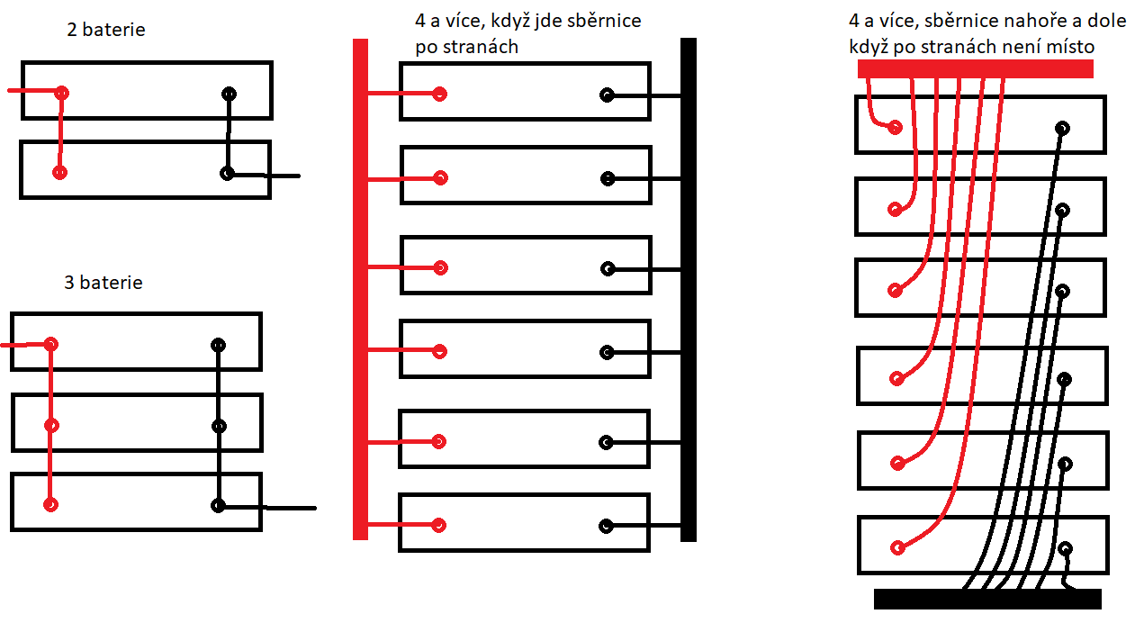 Pokud se zapojuje více battery packů tak se v rozvaděči ty baterie dávají nad sebe a buď máte společnou měděnou sběrnici po stranách kam to připojujete, nebo si uděláte jednu nahoře a jednu dole, tzn že horní baterka bude mít krátké plus a dlouhé mínus a poslední baterka dole to bude mít naopak, ale celková délka kabelů bude stejná.