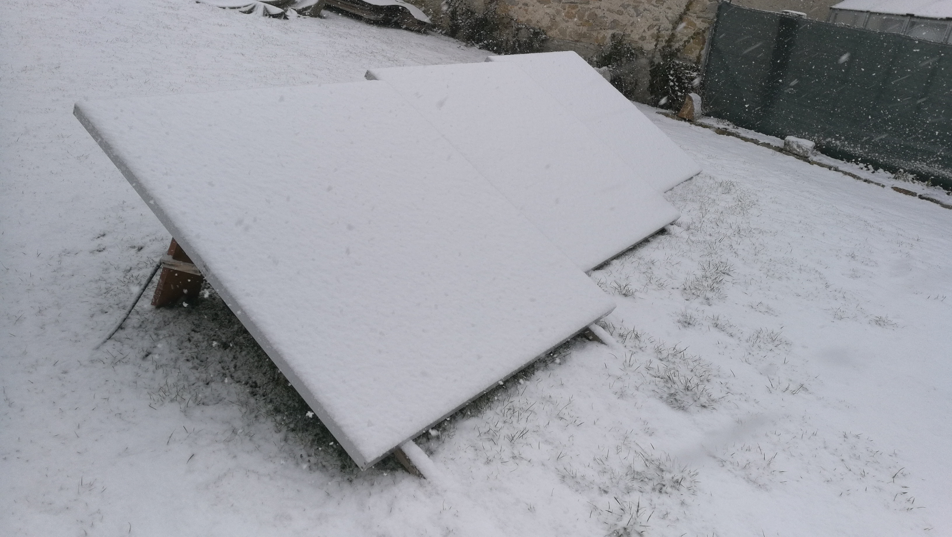 Len som pozrel von oknom a konec sveta. Za 15minut 1cm snehu padne. Podarilo sa Mi očistiť panele,že davali 80W,ale kym som čistil jedne,tak na druhych napadol cm snehu a snaži sa primrznuť. Vyzera to tak,že po obede budem bez energie,bo v baterkach je už iba zopar kWh.