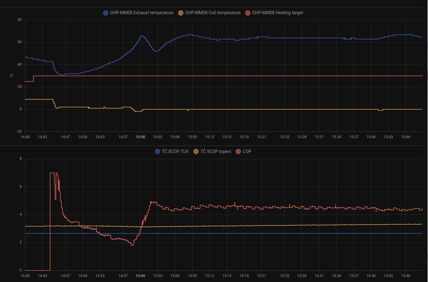 Podobne cisla su aj u mna s prerobenou 2.5kW klimou a MiniHPC regulatorom. Regulaciu mam nastavenu tak, ze pocas dna nastavuje casovac vyssiu teplotu o 1.5°C, aby kurilo prevazne nonstop cez den a vyuzivalo solar a cez noc regulator nastavuje teplotu o +0.5°C aby som vyuzil nizky tarif zo siete (rano a vecer vo vysokej terife nekurim). V praxi to funguje tak, ze cez noc klesne teplota k tym +0.5°C len ked su mrazive dni, takze v prechodnych dnoch mi staci kurit cez den. Ked svieti slnko, tak je to zadarmo, ale ked aj nie, tak cez den je vyssie COP. Za januar COP 3.2 kurenie a 2.27 na TUV (48°C)