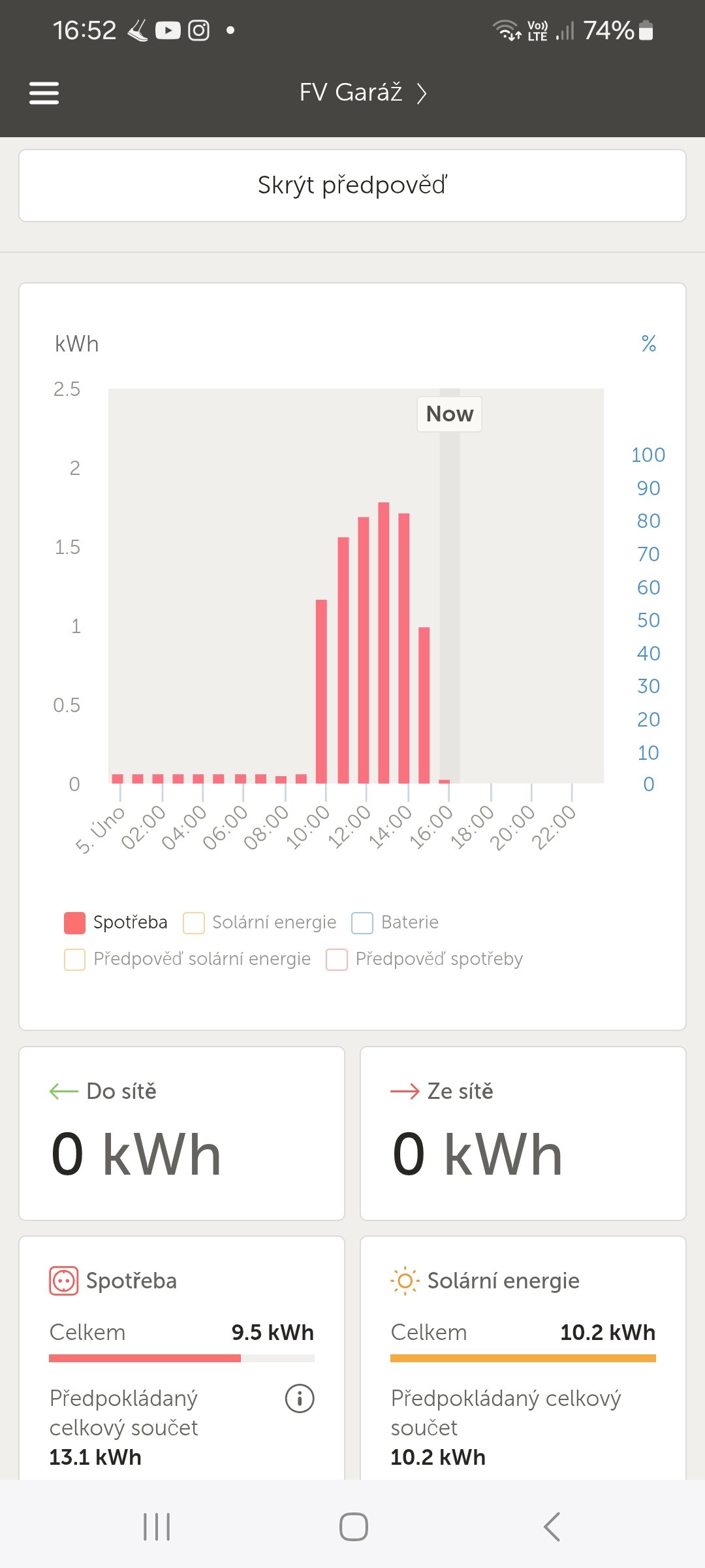 Ještě k tomu grafu spotřeby 9,5KWh, co jsem dal výše. Na tento graf mám připojeno FV pole o výkonu 9x500W se špatným sklonem jenom 10st výrobou 10kWh.I přesto pokud je venku slunečno a mrzne, tak s levným Tč(18000Kč) dovede toto pole s TČ vytopit celý dům bez zatěžování baterii.