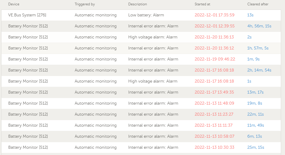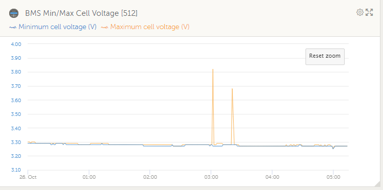 V niektorých prípadoch som videl interné alarmy spôsobené nevyváženosťou článkov, ale to bolo u iného výrobcu (rozumej moj domaci Studer) (zaujímavé je, že tento iný výrobca používa rovnakú správu CAN pre alarmy a výstrahy, takže na tom možno niečo je). Zdá sa, že skutočnosť, že krátka doba nabíjania (pri výpadku siete) to vyrieši, súhlasí s týmto pozorovaním: nevyváženosť jednotlivych cellov.