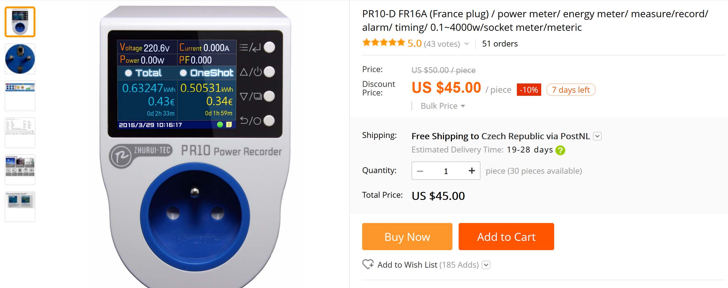 Na měření spotřeby používám celkem luxusní měřák do zásuvky, který si ukládá i průběžná data pro měsíční a roční statistiky. Může zastat i funkci dodatečného jističe - lze nastalit proud 2-max A, při jehož překročení se spotřebič odpojí, po chvíli ho zkusí znovu odpojit a pokud přetížení trvá, nechá ho odpojený. Francouzská verze má naši zásuvku a zástrčku. https://www.aliexpress.com/item/PR10-D- ... 59152.html