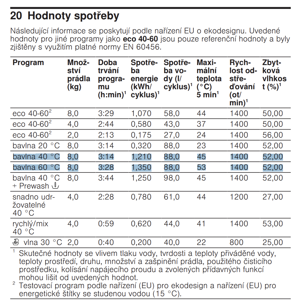 Rozdíl mezi programy bavlna 40 a 60 je 140 Wh. Rozdíl max teplot je 8 stupňů (53 - 45).