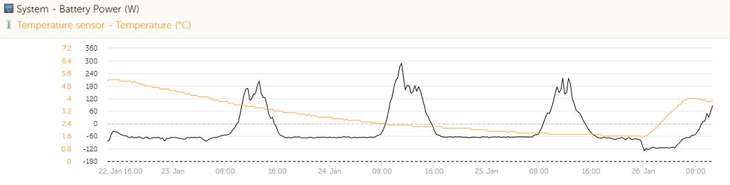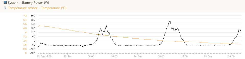 Výsledek je myslím vypovídající - křivka spotřeby naskočila ve 23:51, okolní teplota dorazila k 4°C v 06:49. Přitom okolní teplota ještě v noci klesala. Teď už vnitřní teplota klesá - hysterezi termostatu mám nastavenu 2-4°C. Pokles spotřeby ráno je dán dvěma fakty. Čidlo termostatu je jiné, než měření teploty pro Victron. Takže termostat vypnul někdy kolem 06:00 hod a topení ještě dojíždělo. A pak kolem 08:00 začaly dobíjet panely. Tohle je +- výkon z baterií. Takže topný drát funguje. Jestli dostatečně i při nižších mínusech, snad to nebudu ještě tuto zimu testovat