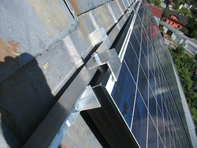 Panely na jizni strese, odklon 22 stupnu na jih. Detail uchyceni na strechu vlastni konstrukce pomoci hlinikovych L profilu. Temná komora se střídačem, regulátorem, jištěním a bateriemi: