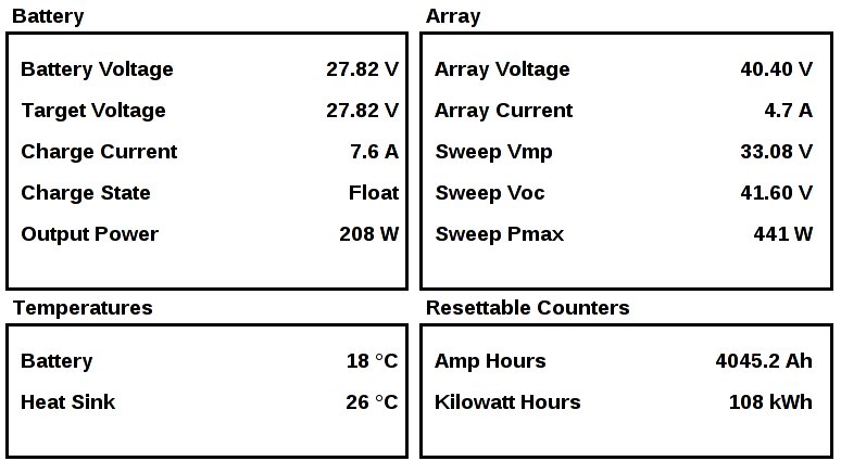 Tristar MPPT 60 se v zásadě pohybuje ve čtyřech režimech: MPPT, Absorbtion, Float a Night a tomu přizpůsobuje cílové napětí. Je to dobře popsáno v manuálu, je tam i graf. Manuál je volně ke stažení na stránkách Morningstaru. Grafy ve webovém rozhraní nejsou. Screenshot historických dat je už tady ve fóru, aktuální data přikládám.