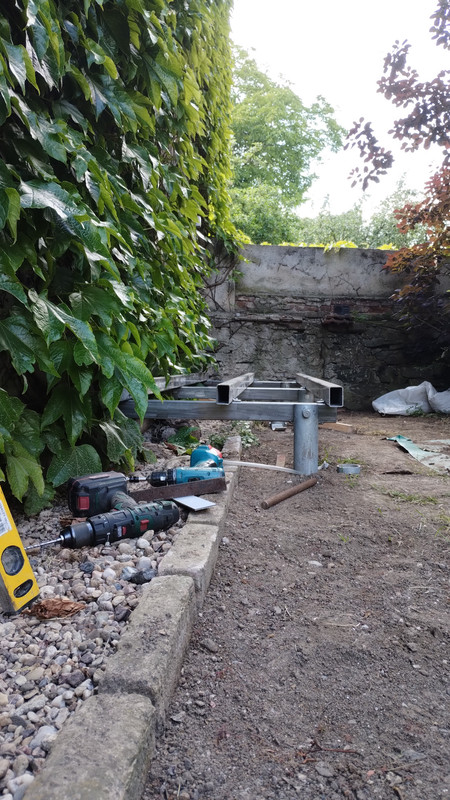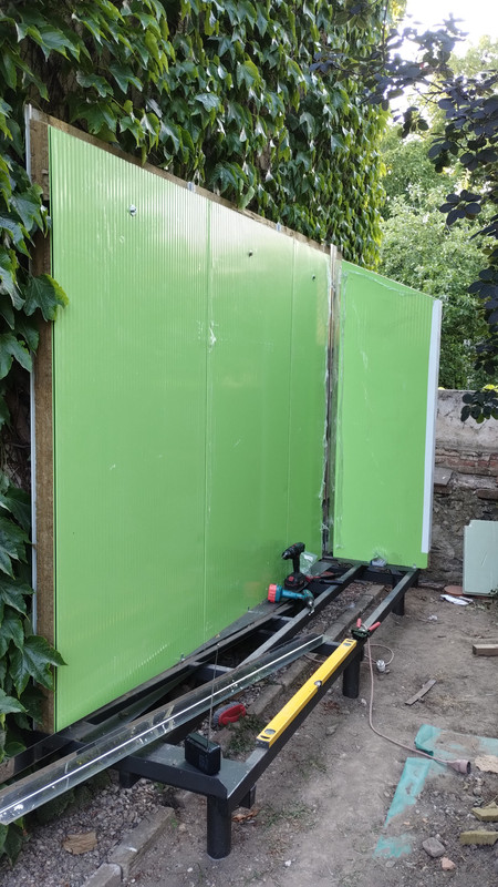 1) začátek června, 60 haků je na střeše, vzorně zabroušených a jede se na druhé uzemnění 2) pokopáno, pohrabáno 3) 16.6. základy na boudu 4) konec června, zápas s metrovou dírou přes roh baráku 5) 2 dny a 4 korunky v čoudu, ale je přes roh vidět 6) 9.7. výřezy panelů jsou doma a začla stavba 7) jde to pomaleji, než si páneček myslel 21.7. pak menší zdravotní pauza s boreliemi a tetrákem, na slunce jsem fakt nemohl