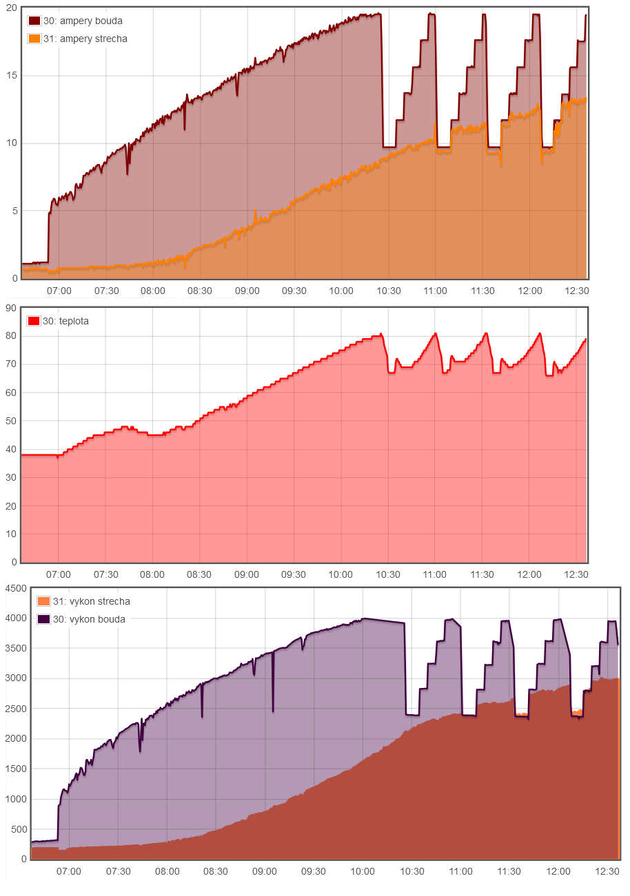 tak nabíjecí proud jsem vyřešil snížením napětí stringu ze 400V na 200V, teď vídám i nabíjecí proud 150A do baterie. Nicméně chci upozornit na přepanelování stringů. Na stringu mám asi o kilowattu víc wp a teď v létě se přehřívá MPPT a měnič omezuje výkon toho stringu. Dopoledne vylezou ampéry na stringu na 19,5A a tam je drží protože víc nezvládne zároveň s tím ale stoupá teplota až k 80°C jakmile přeleze na 81°C tak mppt omezí výkon daného stringu na 10A dokud teplota neklesne. Potom postupně během půlhodiny přidává po 2A proudu z mppt projevuje se to v grafech jako schody až do plného výkonu. Pak zase stoupá teplota a děj se takhle opakuje několikrát přes poledne kdy je největší výkon. Takže opatrně na ty Wp per string. O moc se to přetěžovat nedá.