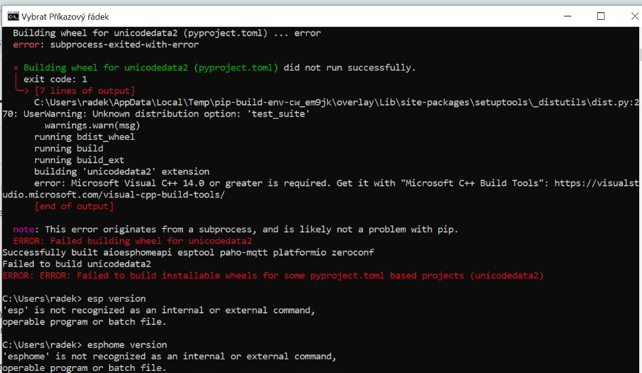 Pokusil jsem se 2x naistalovat v 3.13, vykázalo to stejnou chybu, odinstaloval jsem to tedy celé z PC a nainstaloval V3.12.8 a celý proces proběhl snad úspěšně, na konci jsem zadal "esphome version" a ukázalo to verzi z 2024.12....