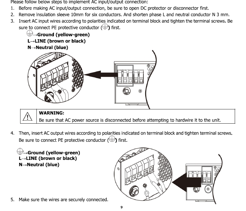 V manuálu schémata nejsou, jenom obrázek svorkovnice: připojení AC z distribuce a AC výstupu: