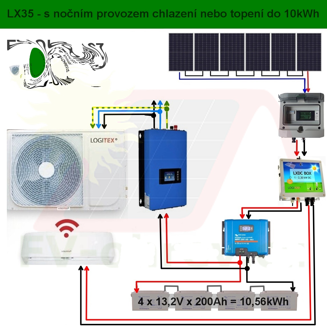 V tomto konkretním případě na schematu a zaroveň nejčastější variantou a volbou zákazníků se používá výkon PV-Modulů co nejblíže 2300Wp/12A což je MAX hranice Bojleru = v ten moment zůstává tedy něco na střeše, protože odběr Klimy u varianty LX35 je max.1510W pro topení a max.1580W pro chlazení.