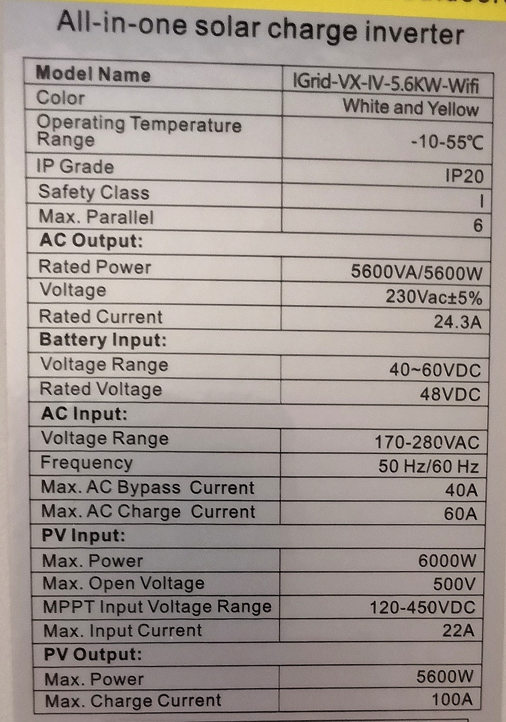 Dle štítku tam mppt do baterky může dát až 100A a nabíječka ze sítě max 60A.