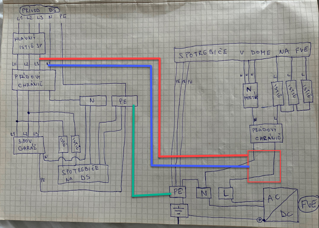 Abych to upřesnil. Po rozdělění TNC na TNS již NIKDY nesmí dojít ke spojení N. PE můžeš připojit na PE nebo PEN, ale PEN nemůžeš připojit na samostané PE.Migel píše: čtv zář 28, 2023 7:28 amDakujem velmi pekne za vysvetlenie.takze N nespajat a radsej prepinat aj N keby som sa predsa len rozhodol prepinat siete.A teda to PE s DS spojim s uzemnenim fve cize PEN.