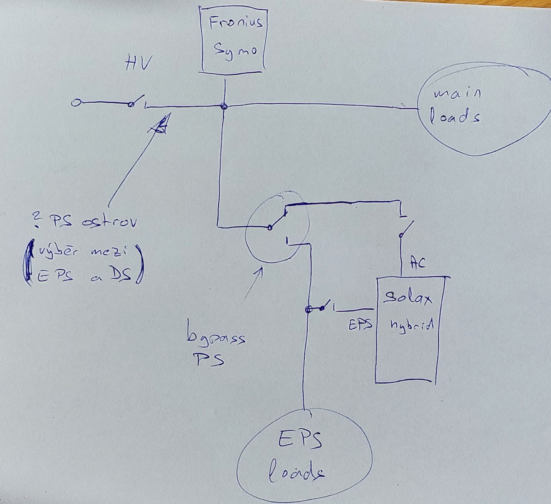 Druhá a spíš první otázka je, kam umístit přepínač sítě pro volbu ostrovního režimu? Nejradši bych ho dal hned za HV (hlavní vypínač), ale nevím, co na to Solax, když by se mu tak propojila EPS svorka s AC svorkou?