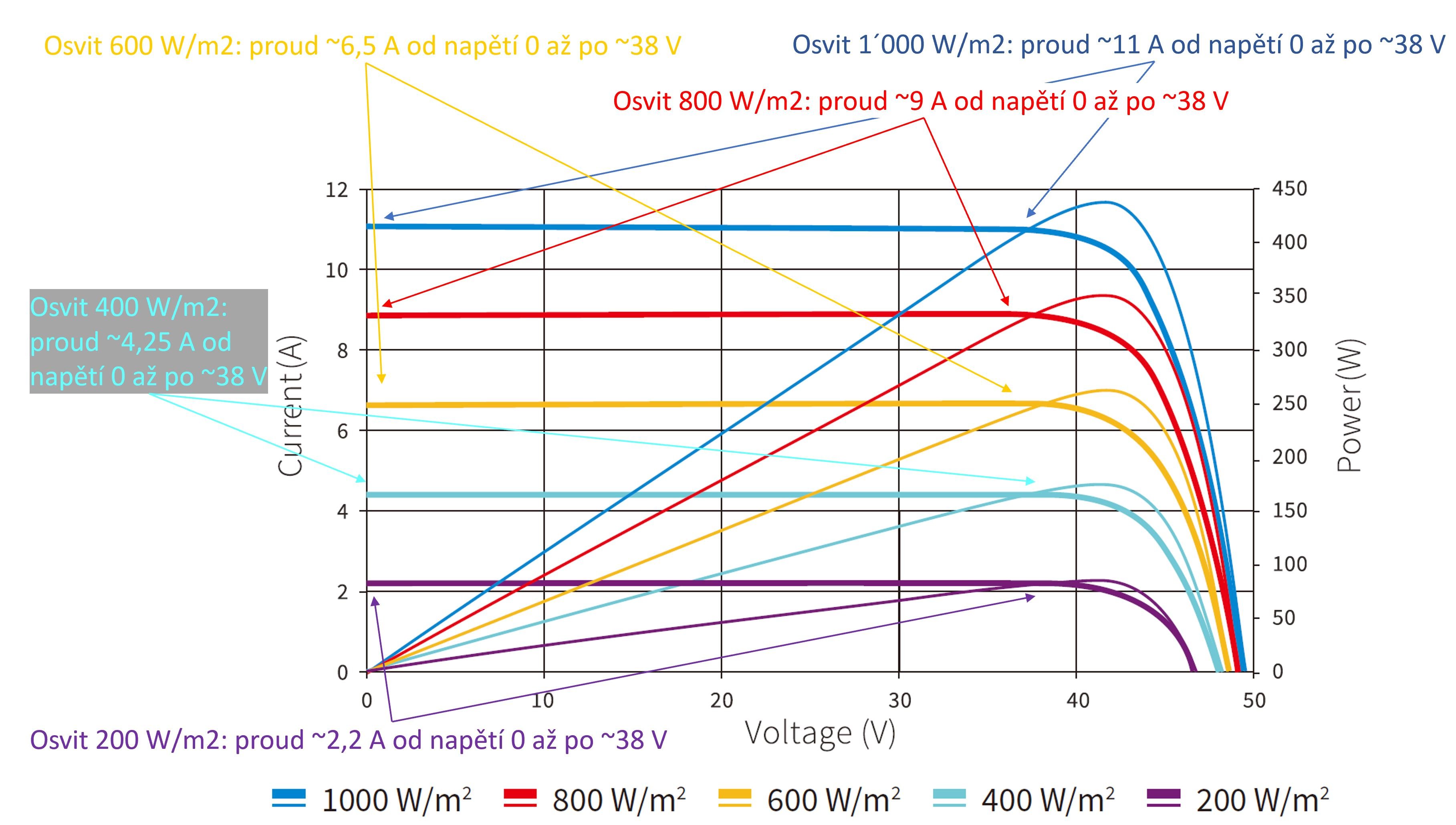 Jak já to chápu: Ano, panely jsou proudový zdroj, ale, jak tomu rozumím z VA-charakterstiky, tak celkem "tvrdý". A úroveň toho "tvrdého" dodávaného proudu závisí na osvitu: vyšší osvit ---> vyšší proud pro všechna napětí od 0 V až do cca Ump, nižší osvit ---> nižší proud pro všechna napětí od 0 V až do cca Ump. Dovolil jsem si na příkladu VA-charakteristiky náhodně vybraného běžného panelu ilustrovat ***moje*** (ne)porozumění dané problematice - viz příloha.