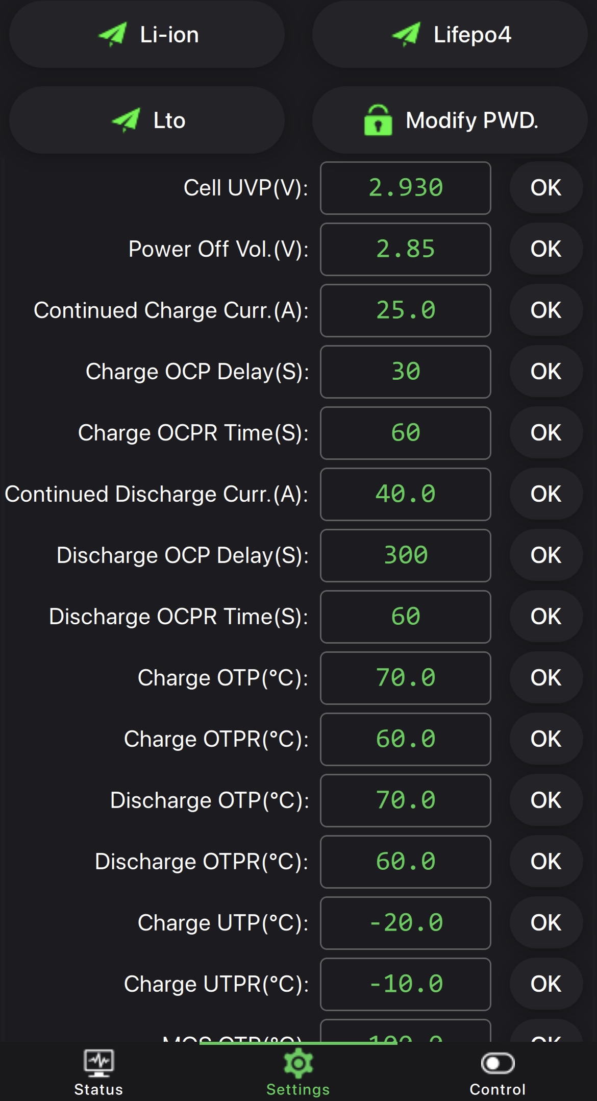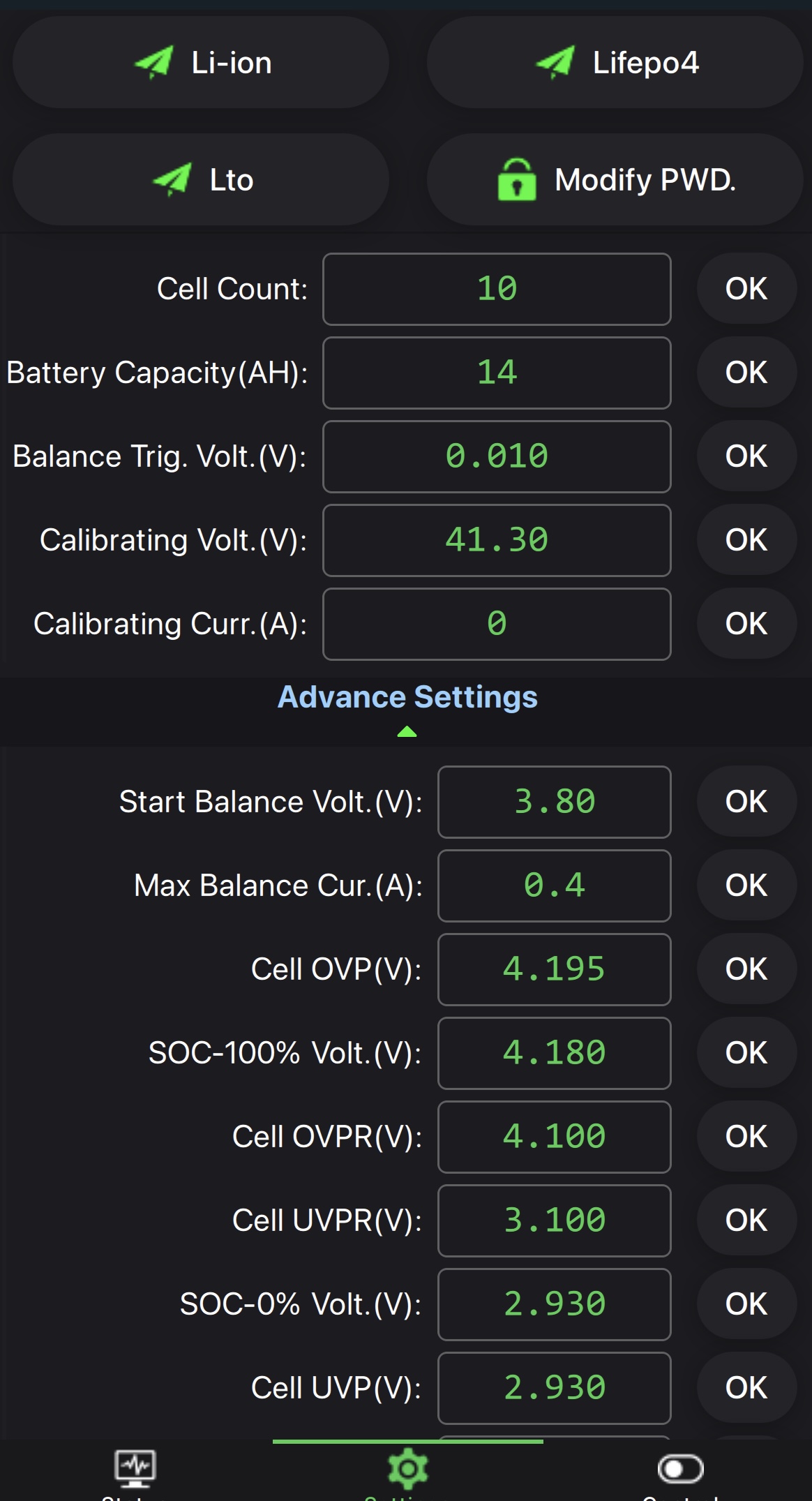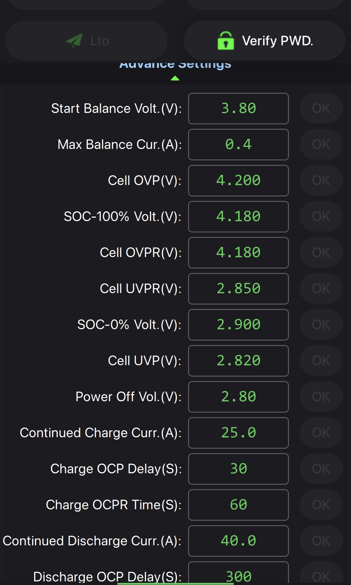 Clanky jsou LI-ION 14Ah provozni napeti 2,75-4,2V. Chtel jsem BMS nastavit UVP 3.1V ale BMS mi nedovoli dat vice jak 2.930V nevim proc pri vyssi hodnote hodi hlasku SENDING FAILURE. Nastaveni BMS takto v pohode nebo neco zmenit? Diky