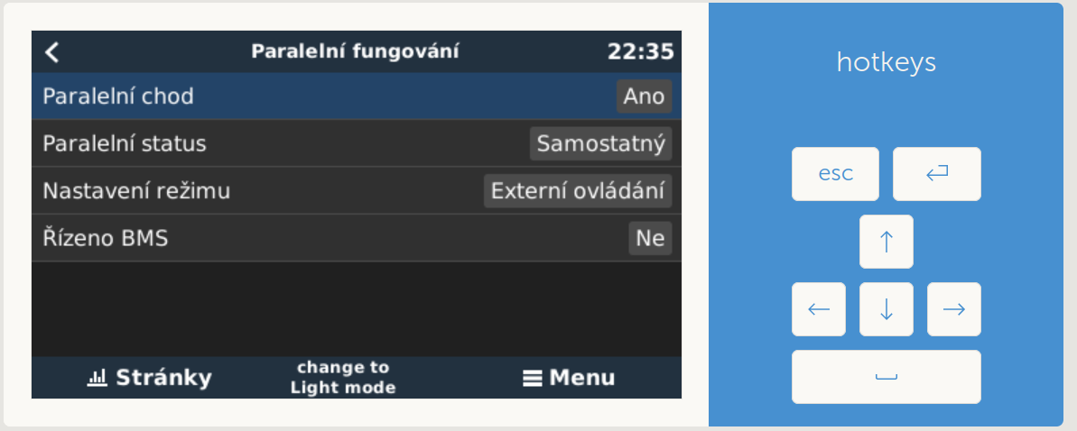 takhle to vypadá v noci, ale přes den je tam místo samostaný něco jinýho, ale zrovna si nevzmomenu co. Ale hlavně nahoře je paralelní chod. Mám jeden mppt s BT a druhej ne, takže tu "smart síť" jaksi nemůžu použít. A měnit ho kvůli tomu nebudu. Ten co je připojenej přes can a má BT hlásí, že je "samostatný" tj předpokládám, že je master a ten co dávám printscreen je slave.