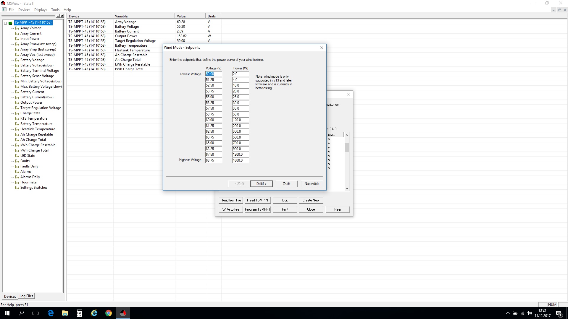 Ahoj momentálně ladím křivku, tady je nějaký odhad. Zdá se mi, že nejlepší výkon dodává asi při 60 voltech. Při vyšších otáčkách se mě zdá že se vrtule zahlcuje a výkon klesá, jedná se o devítilistou. Bohužel nevím jaké jsou otáčky, otáčkoměr je ještě v krabici, na stožár půjde až na jaro. Pokud má někdo nějaký tip jak upravit křivku budu rád.peater píše:Ahoj, stal jsem se majitelem tohoto regulátoru který chci provozovat na větrné elektrárně. Mám generátor 48V "1600W" a systémové napětí 48V. V Tristaru je nahraný firmware pro větrné elektrárny. Jedná se mě o to, jakou nastavit vhodnou křivku pro tento generátor.