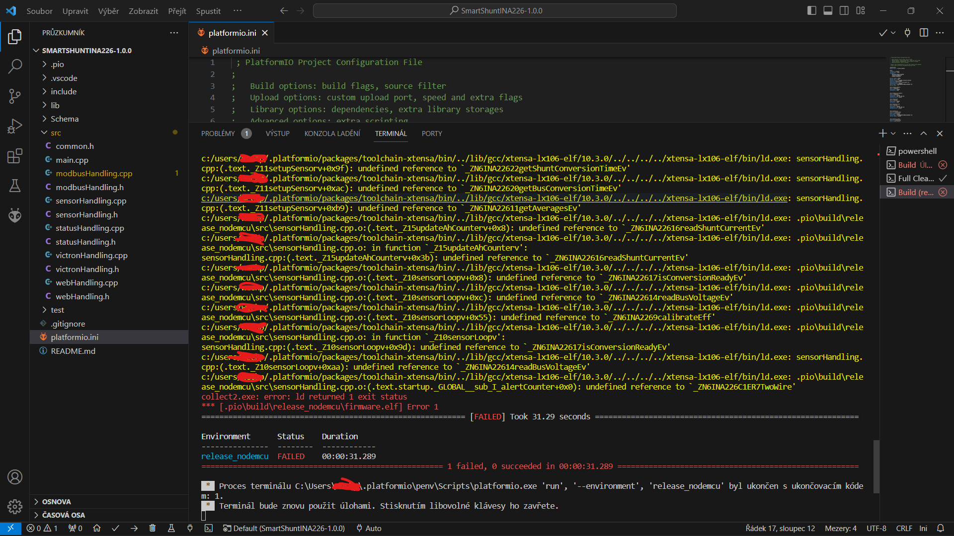 VisualStudioCode jsem měl z pokusů s tím elměrem, no, tak platformIO nainstalované, stažené source z githubu, při prvním pokusu o build to řvalo něco o chybějící ina226,h, tak jsem to na tom githubu našel a stáhl z dalšího, pleskl do lib, tak to pak už neřvalo. Tak to půl minuty něco dělalo a končí žlutým textem
