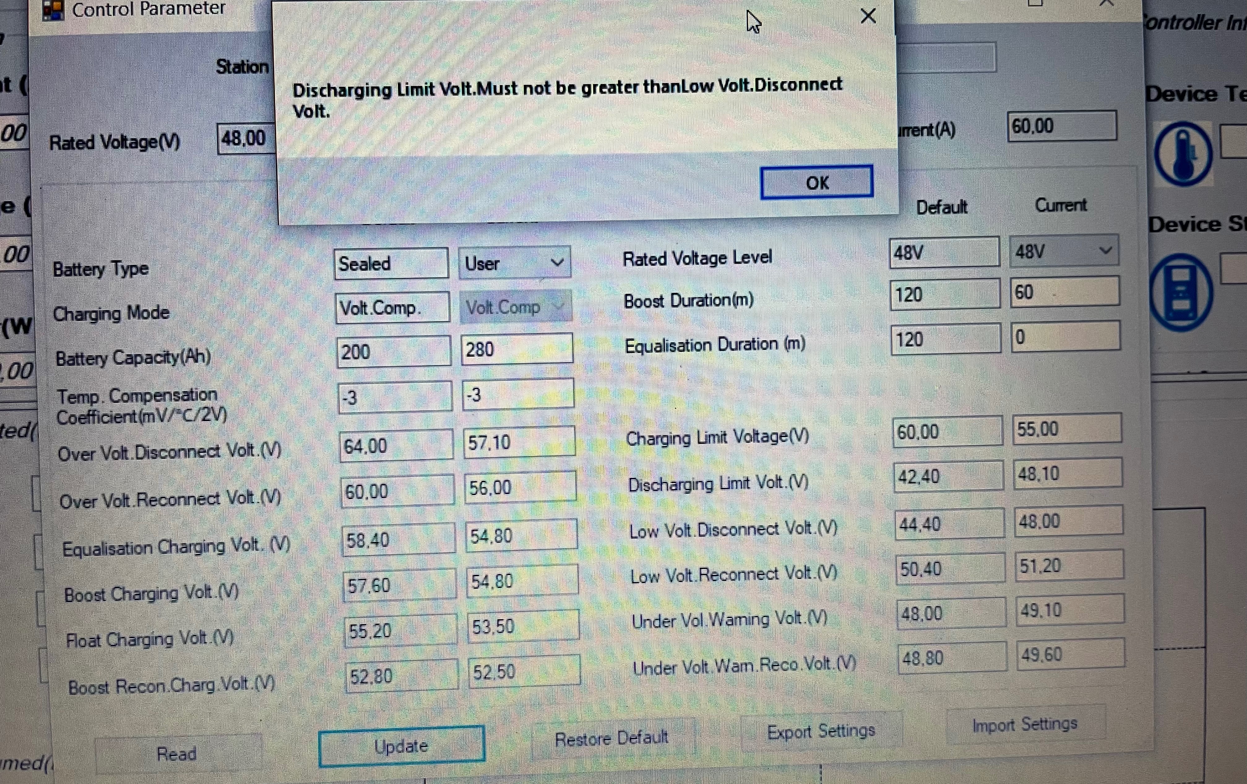 Tak dnes jsem to nahral jen discharging limit volt mi dovoli nastavit jen maximalne to co je v low vol. disconnect tudiz oboji mam na 48V to by melo byt v pohode?
