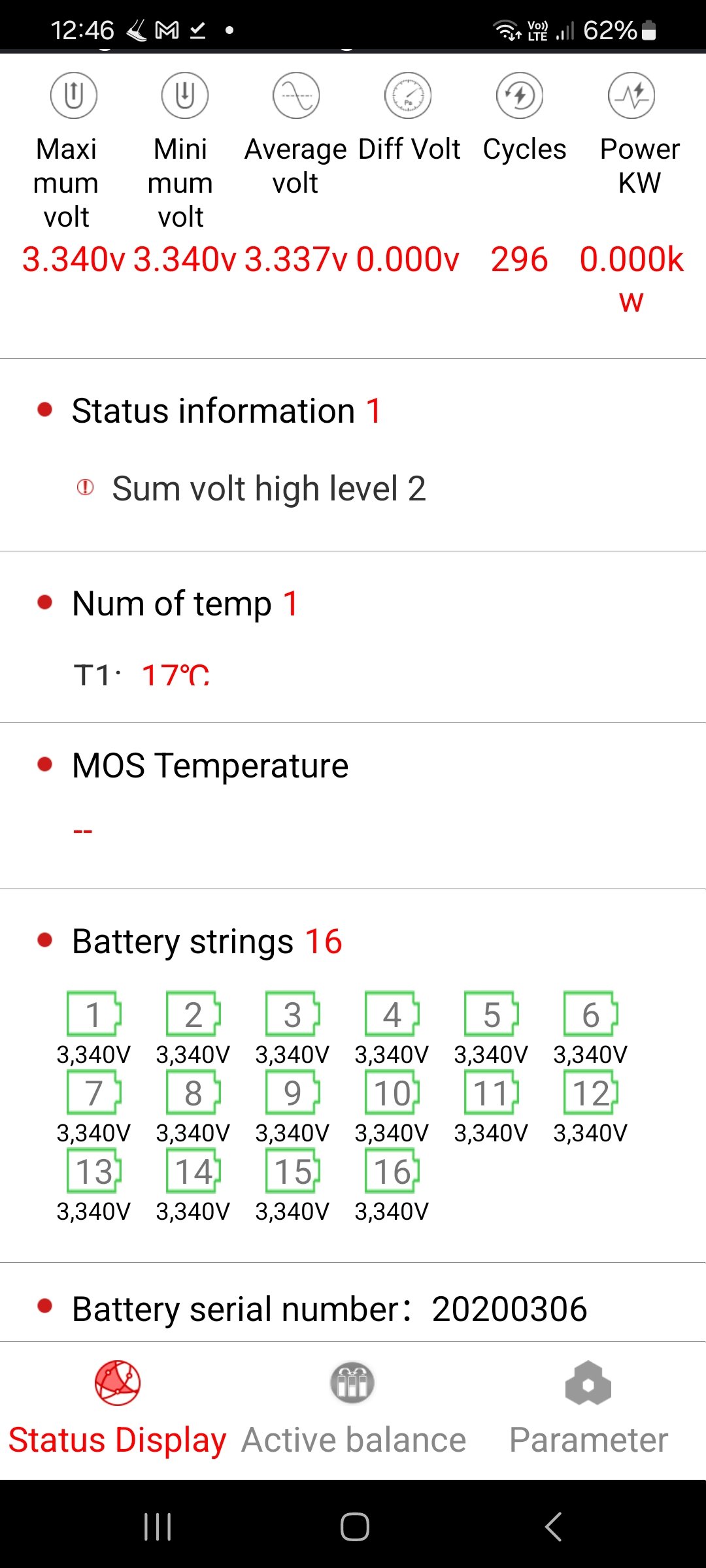 Takto jsem to měl původně, na Victronu 51,8V , na BMS 3,65V. Výsledek byl, že 1 - 2 články byly nabité na 3,65V a 1 - 2 články 3,38V. Ostatní někde mezi. Proto jsem to omezil přímo v BMS na 3,50V. Ale pořád, když je plně nabito, tak 1 - 2 články mají těch 3,50V, ale 1 - 2 články jdou nejvíc na 3,45. No a při vybíjení mi tyto míň dobité články vyhodí baterku, protože spadnou jako první na 2,8V.Soban píše: pát bře 22, 2024 10:44 amTak BMS se nastavuje na to co ten článek vydrží, takže u lifepo4 vrch většinou 3.6V či 3.65V a spodek většinou 2.9V či 2.5V prostě dle článků.