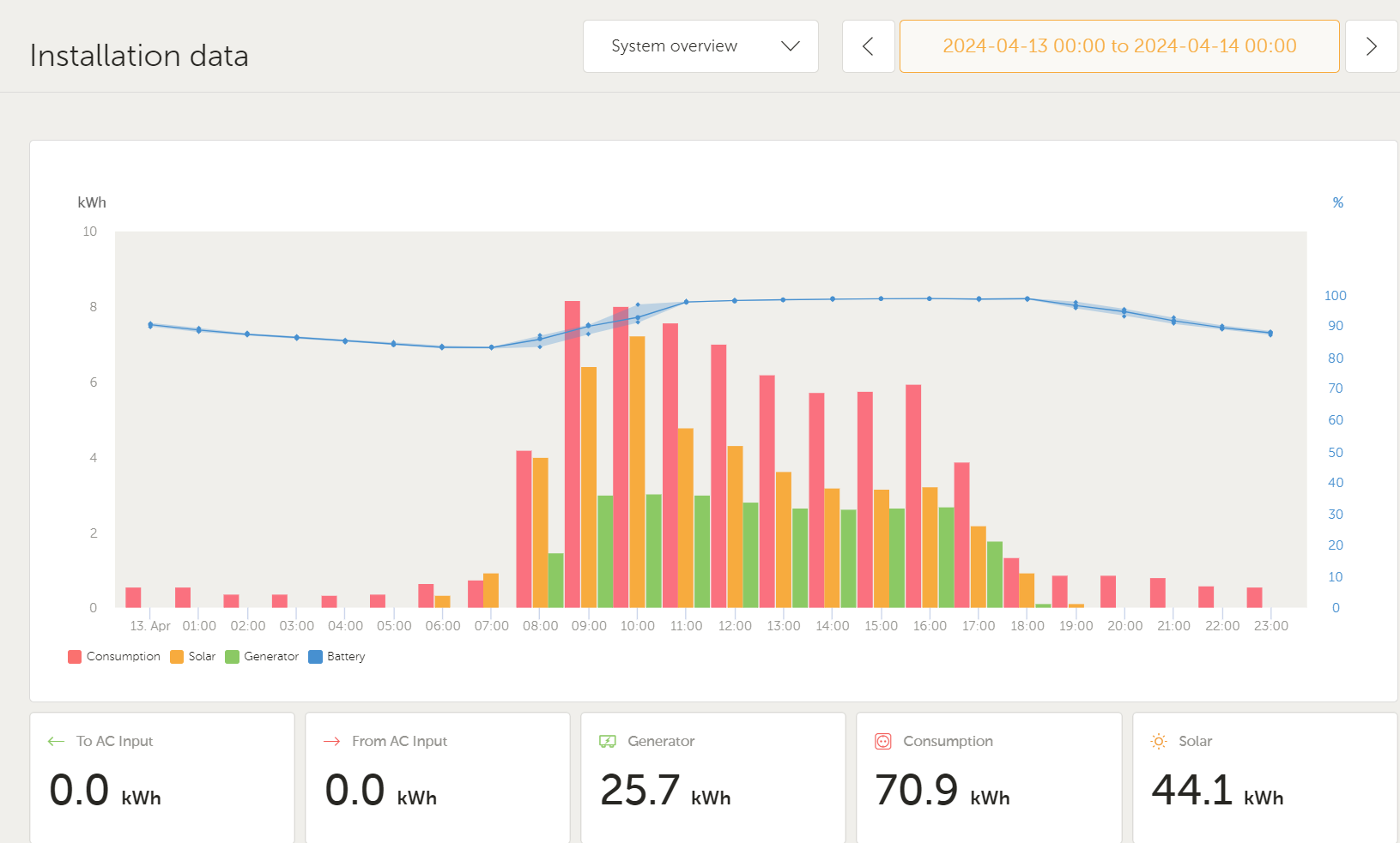 Dnešní graf, nízká zátěž, druhý měnič se ani nespustil. Graf z 13.4. oba střídače v provozu skoro celý den (zelené sloupce), druhý měnič zkresluje údaje o celkové spotřebě consumption, správně je údaj solar.