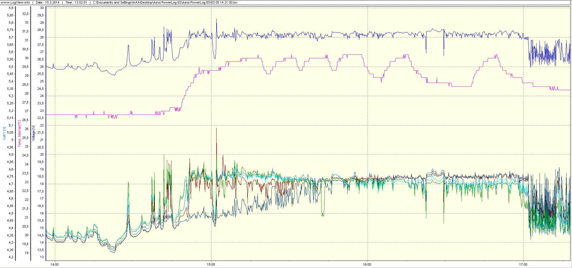 Od priateľa na fóre mám namiesto pôvodných 2ks 65 Ah (gel) 6 dvojčlánkov Fiamm 200 Ah (AGM) zapojených v sérii, teda znova 24V. Pretože nie sú celkom rovnaké a niektoré už niečo pamätajú - najstaršie z nich sú z roku 2003, doplnil som ich balancerom podľa p. Zajíca. Balancery fungujú na skúšobnej letovacej doske a chladené sú zatiaľ voľne stojacim vetrákom, ktorý bezpečne chladí výkonové tranzistory. Vytvoril som vrabčie hniezdo - profíci nech sú zhovievaví: Ako zapojenie funguje, môžeme vidieť na grafe z loggera ( na časovej osi treba odčítať 2 hodiny ): Logger na 6. článku zhadzuje občas napätie na nulu a zneprehľadňuje to graf, preto zobrazím v detaile fázu absorpcie len pre ostatných 5 článkov: So zapojením som maximálne spokojný, napätie na článkoch je orezané na hodnotu cca 4,74 V, starí páni si zaslúžia trochu "vatičky". Cieľovo chcem týmto vetrákom chladiť ešte SSR na reguláciu záťaže, ktorú pripravujem a nahradí terajšie časté cvakanie stykačov - viď časť grafu za absorpciou. Interval záznamov hodnôt napätí je 10 sekúnd.