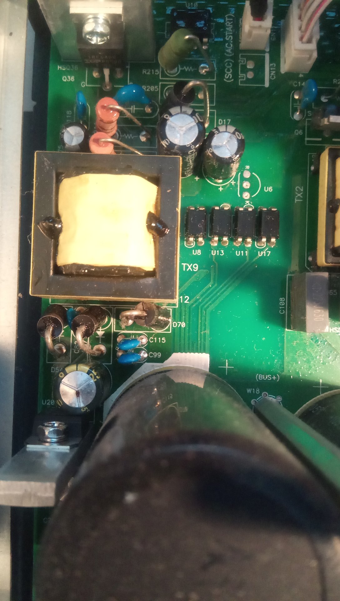 . Nechal jsem to běhat dokud to šlo. Minulý týden jsem přišel domů, měnič měl chybu 10 "snížený výkon". Po resetu chybu 57 "porucha proudového snímače". Měnič musel ze zdi a následovala rozborka. Našel jsem nafouklý kondenzátor C116 a pro jistotu jsem vyměnil i C133.